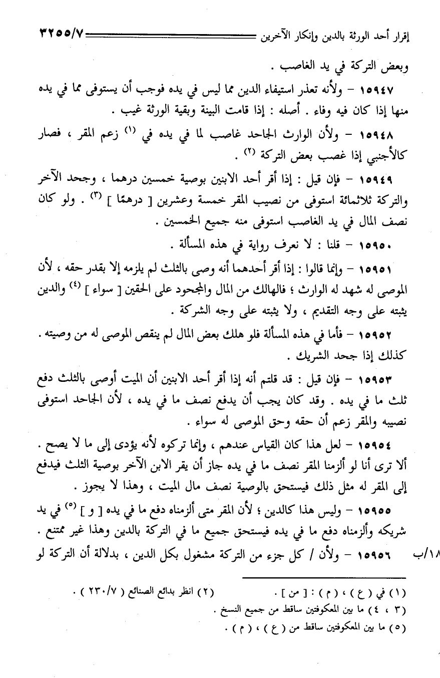 15955 - وليس هذا كالدين؛ لأن المقر متى ألزمناه دفع ما في يده [و] في يد شريكه وألزمناه دفع ما في يده فيستحق جميع ما في التركة بالدين وهذا غير ممتنع.