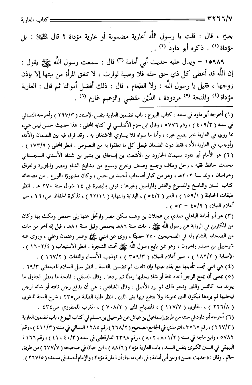 15989 - ويدل عليه حديث أبي أمامة قال: سمعت رسول الله - صلى الله عليه وسلم - يقول: إن الله قد أعطى كل ذي حق حقه فلا وصية لوارث، لا تنفق المرأة من بيتها إلا بإذن زوجها، فقيل يا رسول الله: ولا الطعام، قال: ذلك أفضل أموالنا ثم قال: العارية مؤداة والمنحة مردودة، الدين مقضي والزعيم غارم.