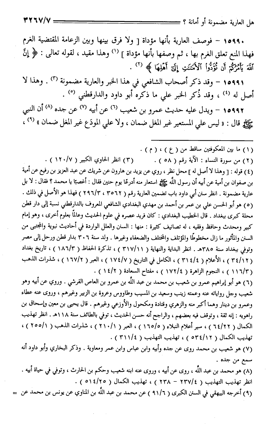 15990 - فوصف العارية بأنها مؤداة [ولا فرق بينها وبين الزعامة المقتضية العزم فهذا المنع تعلق الغرم بها، ثم وصفها بأنها مؤداة] وهذا مقيد، لقوله تعالى: {إن الله يأمركم أن تؤدوا الأمانات إلى أهلها}.