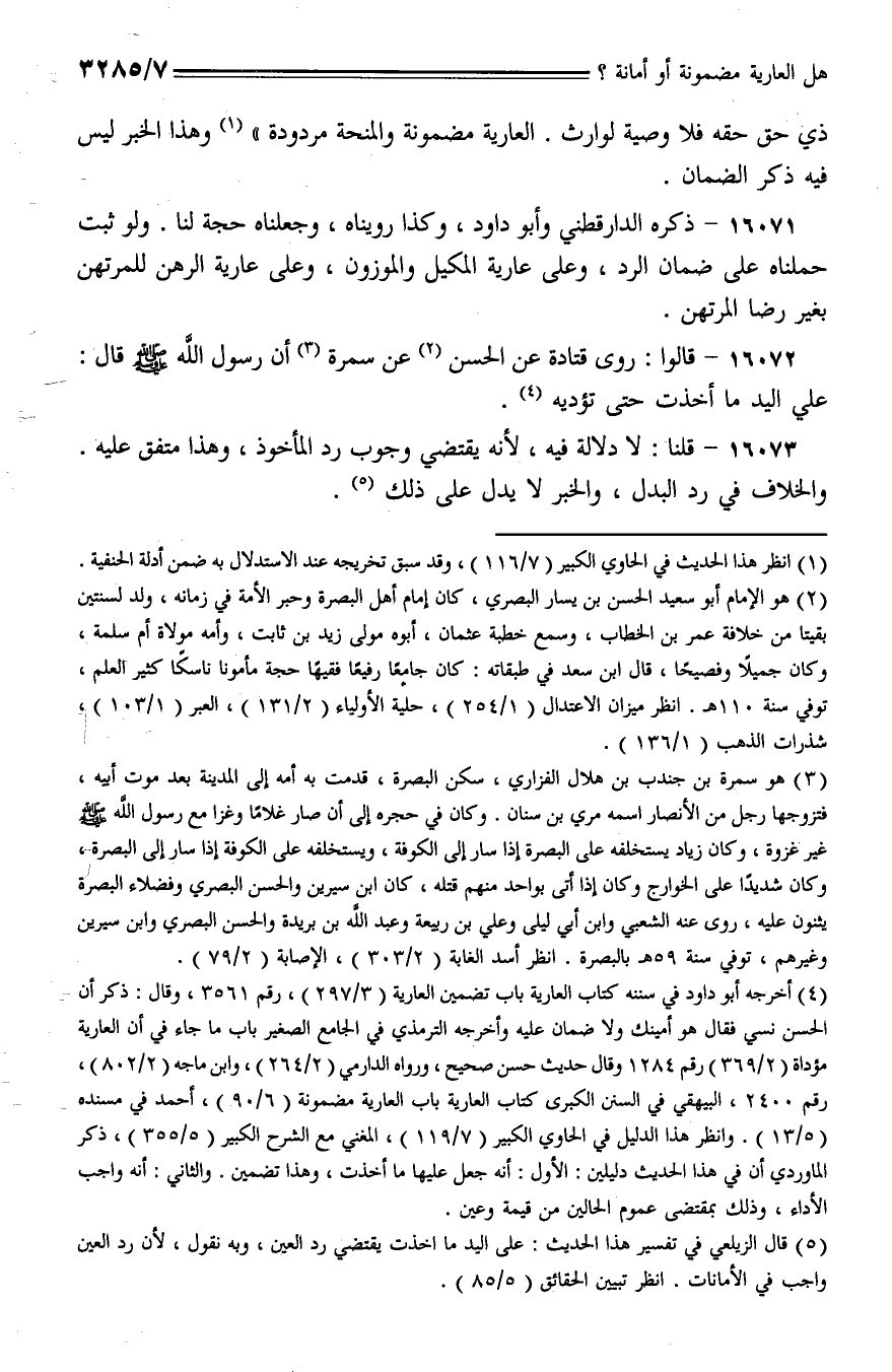 16071 - ذكره الدارقطني وأبو داود، وكذا رويناه، وجعلناه حجة لنا. ولو ثبت حملناه على ضمان الرد، وعلى عارية المكيل والموزون، وعلى عارية الرهن للمرتهن بغير رضا المرتهن.