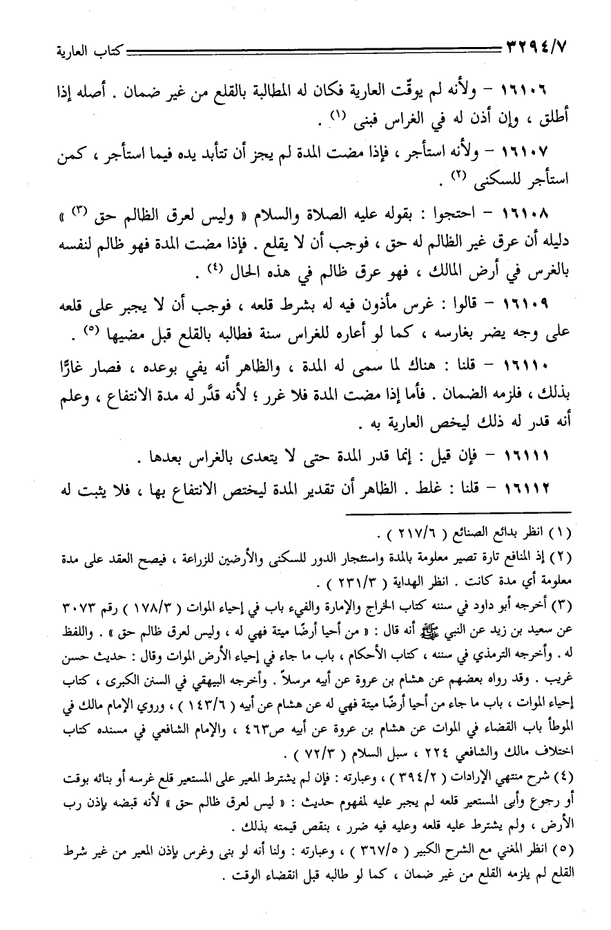 16108 - احتجوا: بقوله عليه الصلاة والسلام (وليس لعرق الظالم حق) دليله أن عرق غير الظالم له حق، فوجب أن لا يقلع. فإذا مضت المدة فهو ظالم لنفسه بالغرس في أرض المالك، فهو عرق ظالم في هذه الحال.