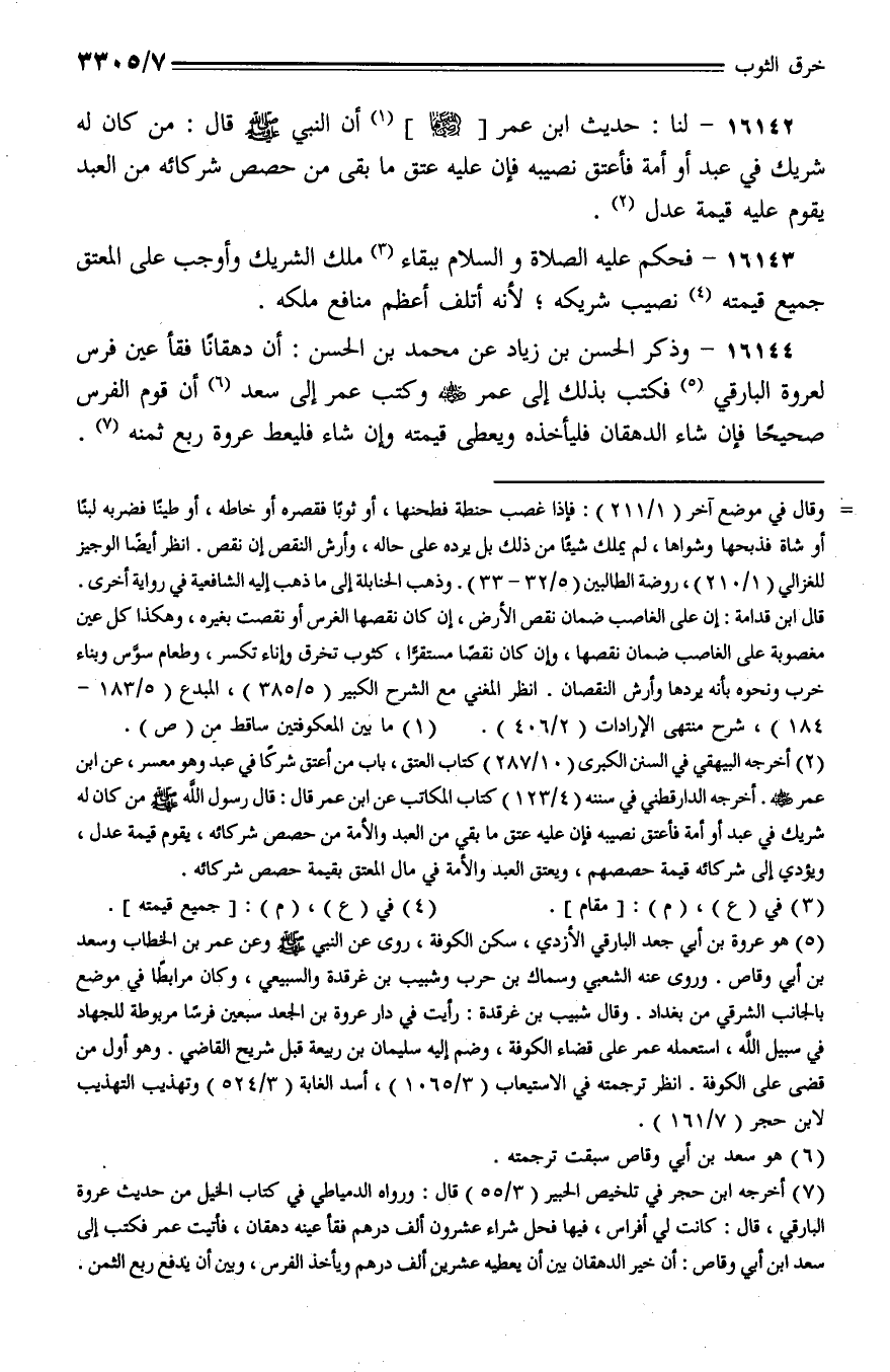 16143 - فحكم عليه الصلاة والسلام ببقاء ملك الشريك وأوجب على المعتق جميع قيمته نصيب شريكه؛ لأنه أتلف أعظم منافع ملكه.