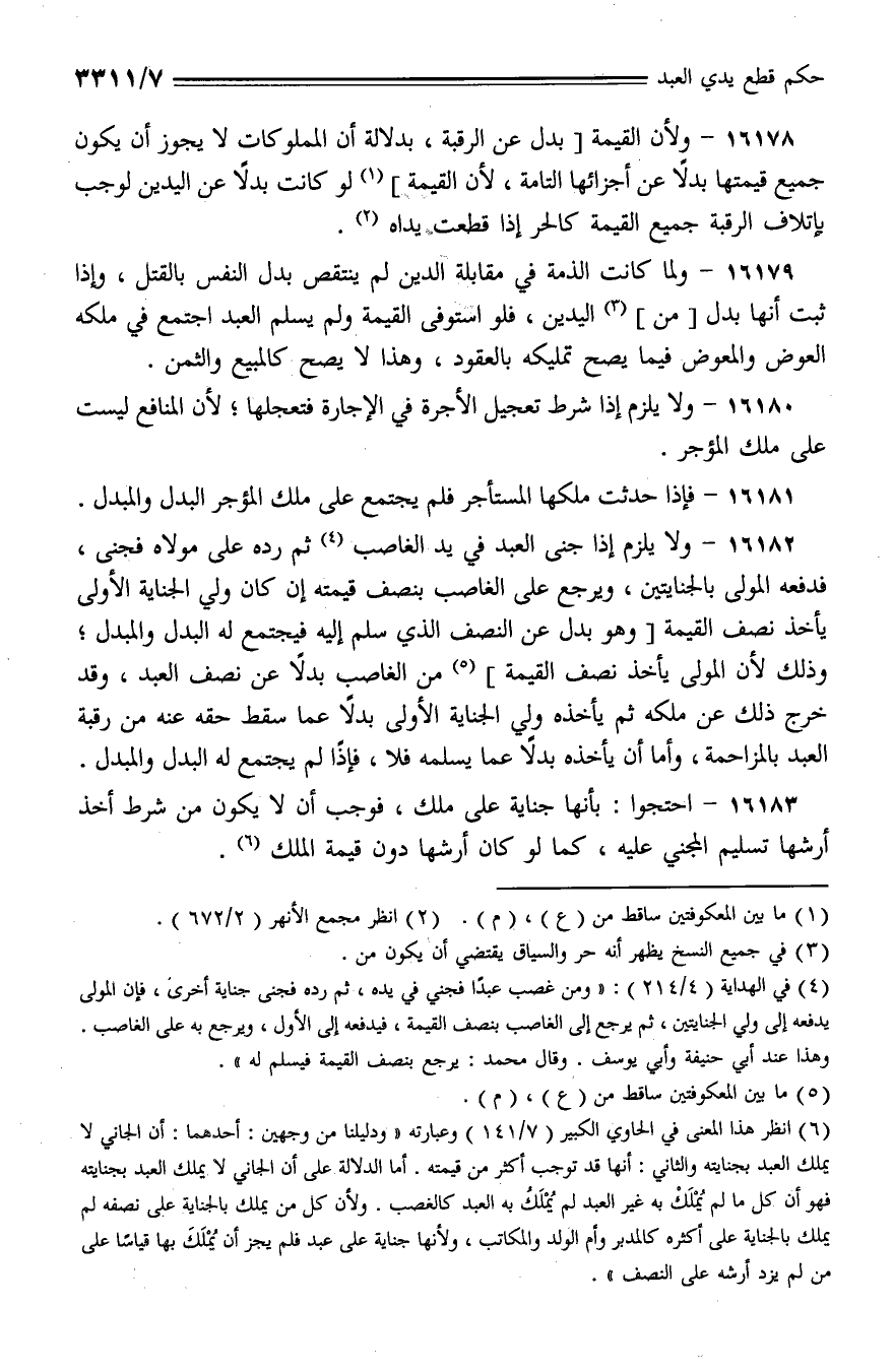 16178 - ولأن القيمة [بدل عن الرقبة، بدلالة أن المملوكات لا يجوز أن يكون جميع قيمتها بدلًا عن أجزائها التامة، لأن القيمة] لو كانت بدلًا عن اليدين لوجب بإتلاف الرقبة جميع القيمة كالحر إذا قطعت يداه.