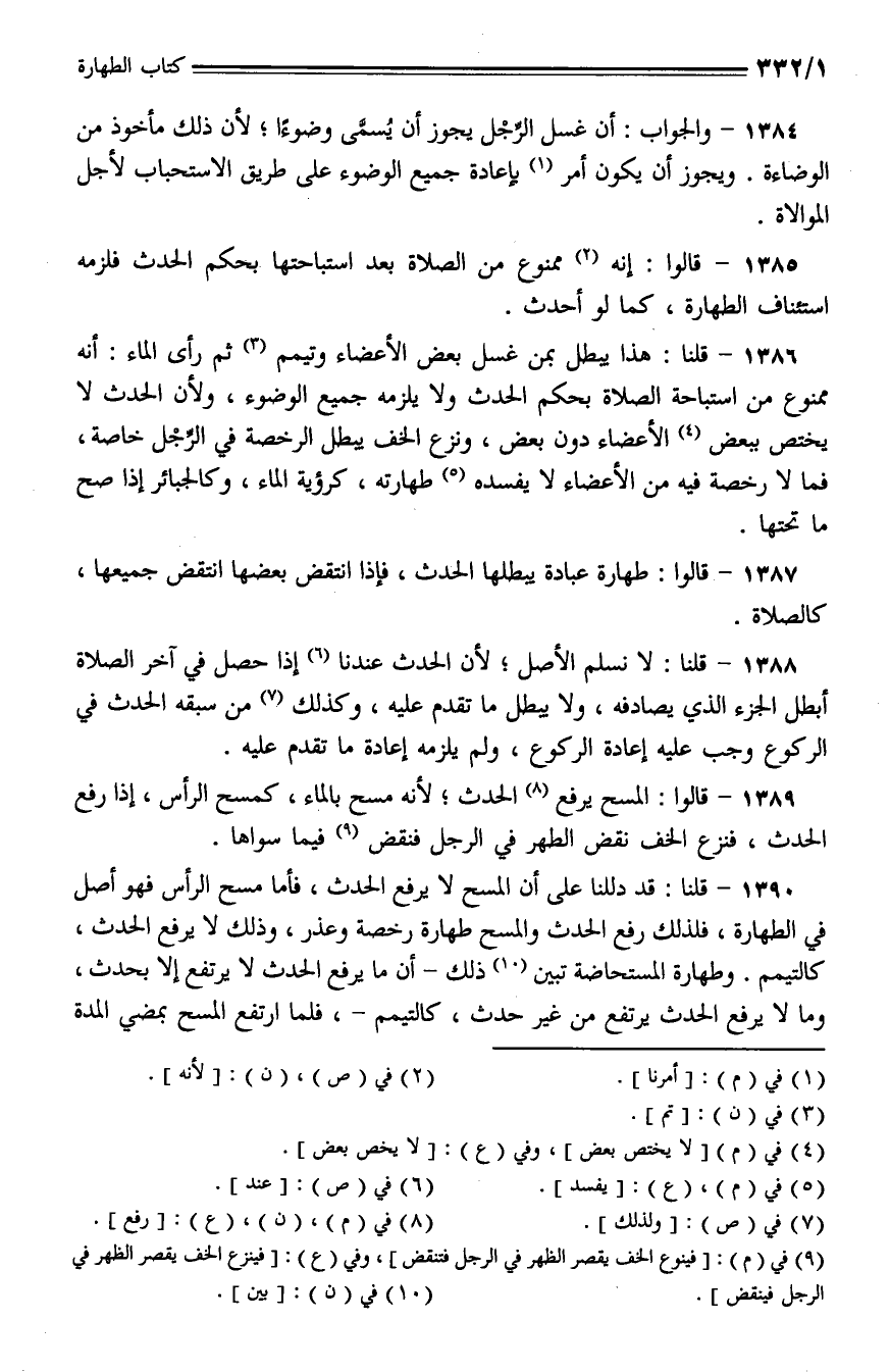 1387 - قالوا: طهارة عبادة يبطلها الحدث، فإذا انتقض بعضها انتقض جميعها، كالصلاة.