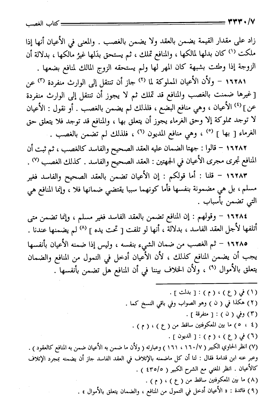 16283 - قلنا: أما قولكم: إن الأعيان تضمن بالعقد الصحيح والفاسد فغير مسلم، بل هي مضمونة بنفسها فأما كونهما سببا يقتضي ضمانها فلا، وإنما المنافع هي التي تضمن بأسباب.