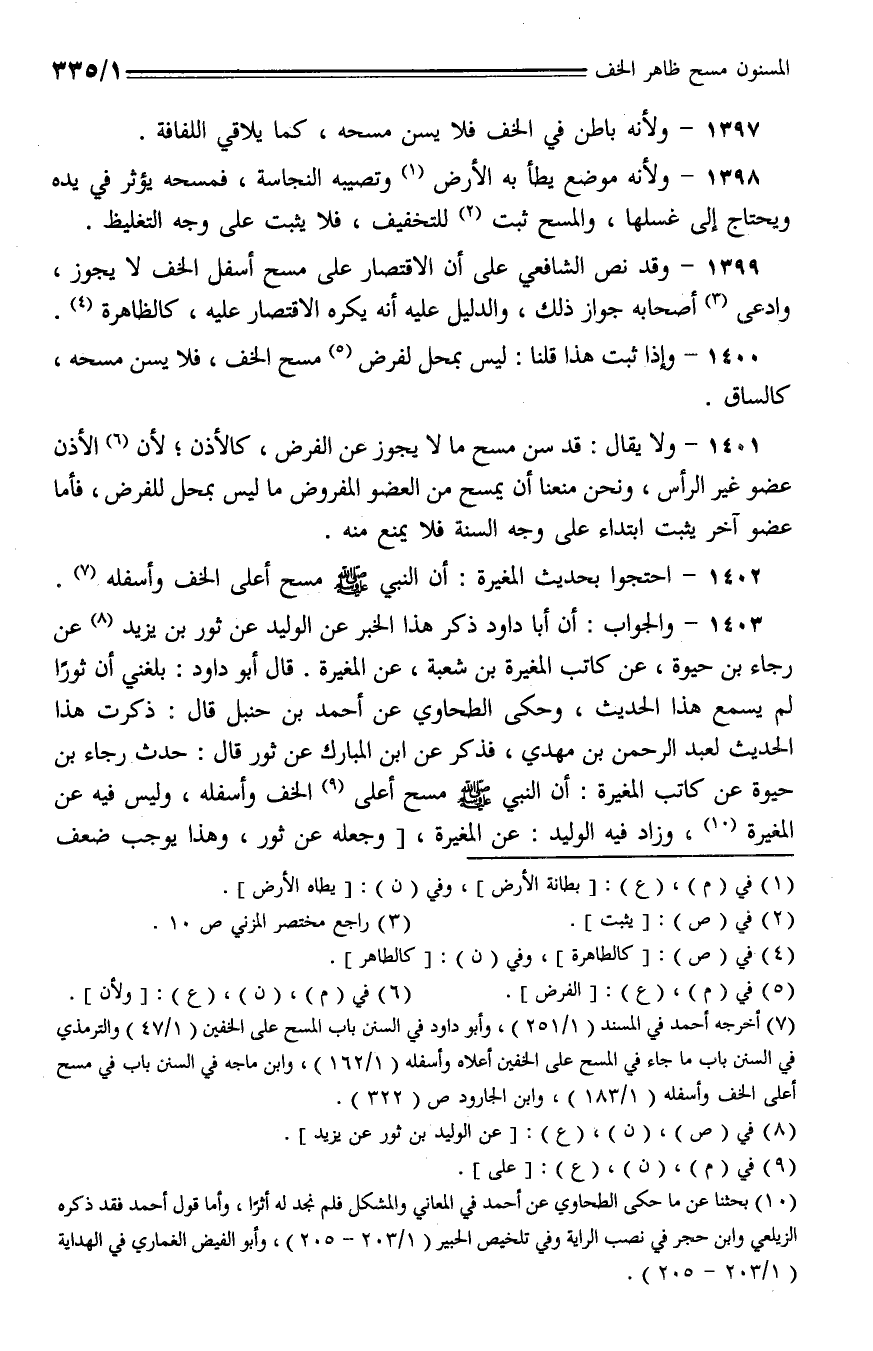 1402 - احتجوا بحديث المغيرة: أن النبي - صلى الله عليه وسلم - مسح أعلى الخف وأسفله.