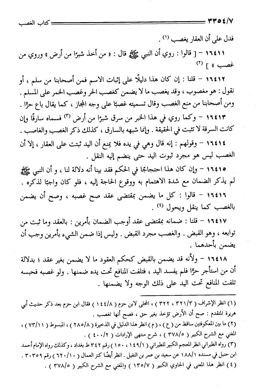 16411 - [قالوا: روي أن النبي - صلى الله عليه وسلم - قال: (من أخذ شبرًا من أرض) وروي من غصب)]