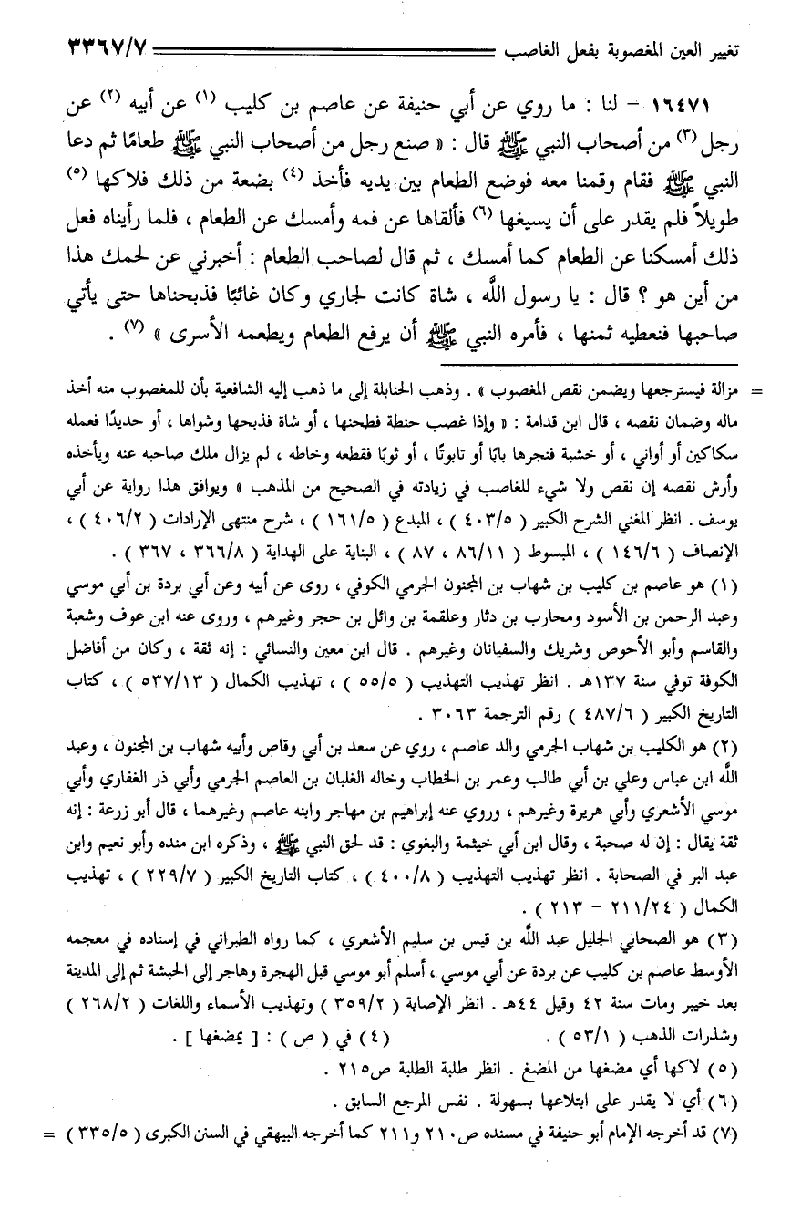 16471 - لنا: ما روي عن أبي حنيفة عن عاصم بن كليب عن أبيه عن رجل من أصحاب النبي - صلى الله عليه وسلم - قال: (صنع رجل من أصحاب النبي - صلى الله عليه وسلم - طعامًا ثم دعا النبي - صلى الله عليه وسلم - فقام وقمنا معه فوضع الطعام بين يديه فأخذ بضعة من ذلك فلاكها طويلًا فلم يقدر على أن يسيغها فألقاها عن فمه وأمسك عن الطعام، فلما رأيناه فعل ذلك أمسكنا عن الطعام كما أمسك، ثم قال لصاحب الطعام: أخبرني عن لحمك هذا من أين هو؟ قال: يا رسول الله، شاة كانت لجاري وكان غائبًا فذبحناها حتى يأتي صاحبها فنعطيه ثمنها، فأمره النبي - صلى الله عليه وسلم - أن يرفع الطعام ويطعمه الأسرى).