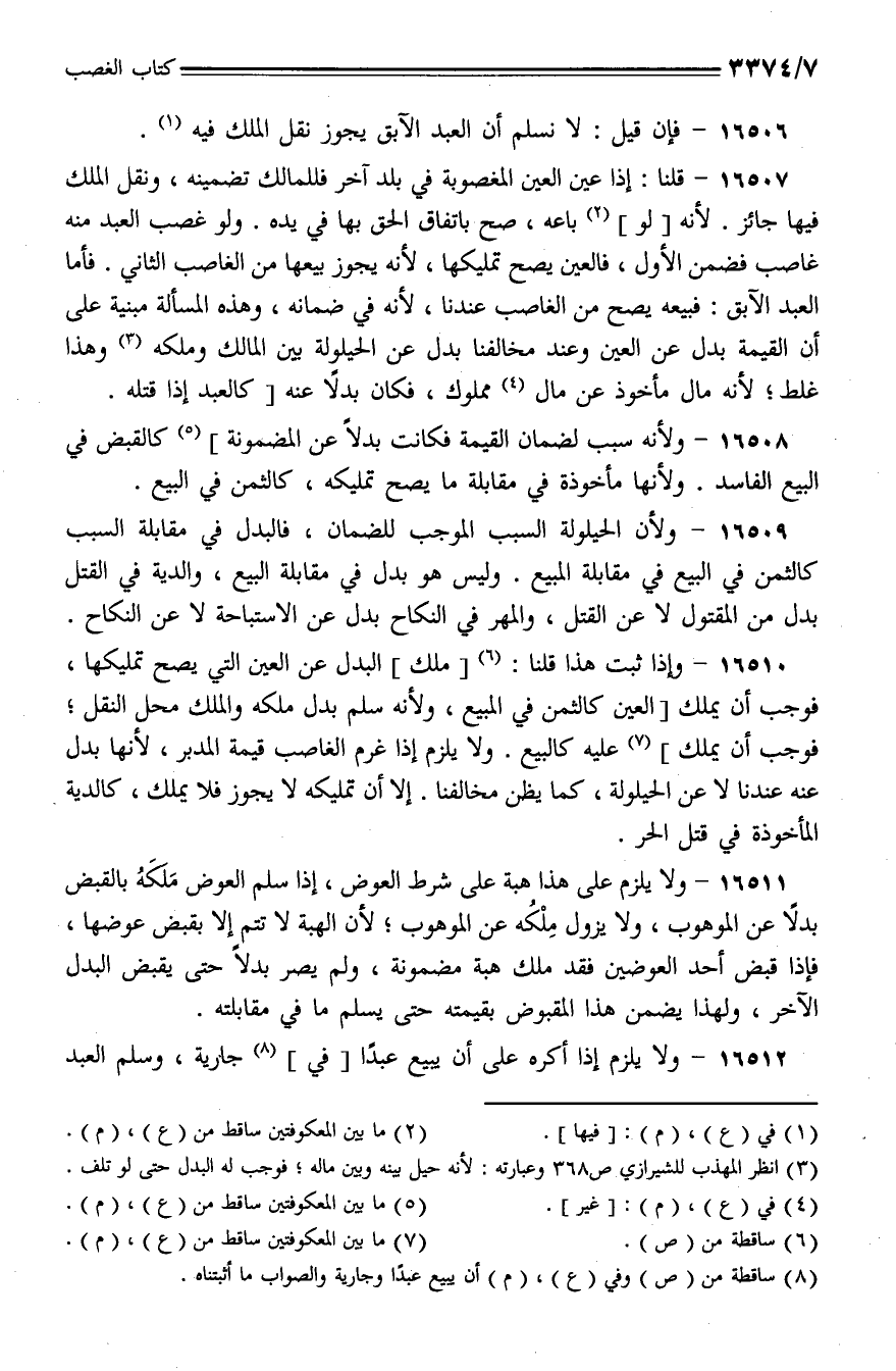 16507 - قلنا: إذا عين العين المغصوبة في بلد آخر فللمالك تضمينه، ونقل الملك فيها جائز. لأنه [لو] باعه، صح باتفاق الحق بها في يده. ولو غصب العبد منه غاصب فضمن الأول، فالعين يصح تمليكها، لأنه يجوز بيعها من الغاصب الثاني. فأما العبد الآبق: فبيعه يصح من الغاصب عندنا، لأنه في ضمانه، وهذه المسألة مبنية على أن القيمة بدل عن العين وعند مخالفنا بدل عن الحيلولة بين المالك وملكه وهذا غلط؛ لأنه مال مأخوذ عن مال مملوك، فكان بدلًا عنه [كالعبد إذا قتله.