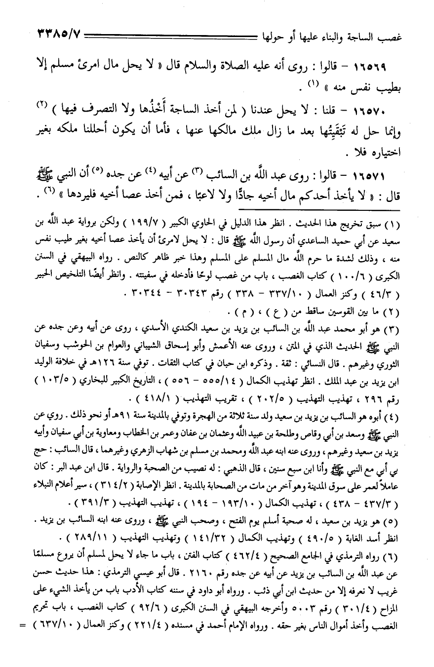 16571 - قالوا: روي عبد الله بن السائب عن أبيه عن جده أن النبي - صلى الله عليه وسلم - قال: (لا يأخذ أحدكم مال أخيه جادًا ولا لاعبًا، فمن أخذ عصا أخيه فليردها).