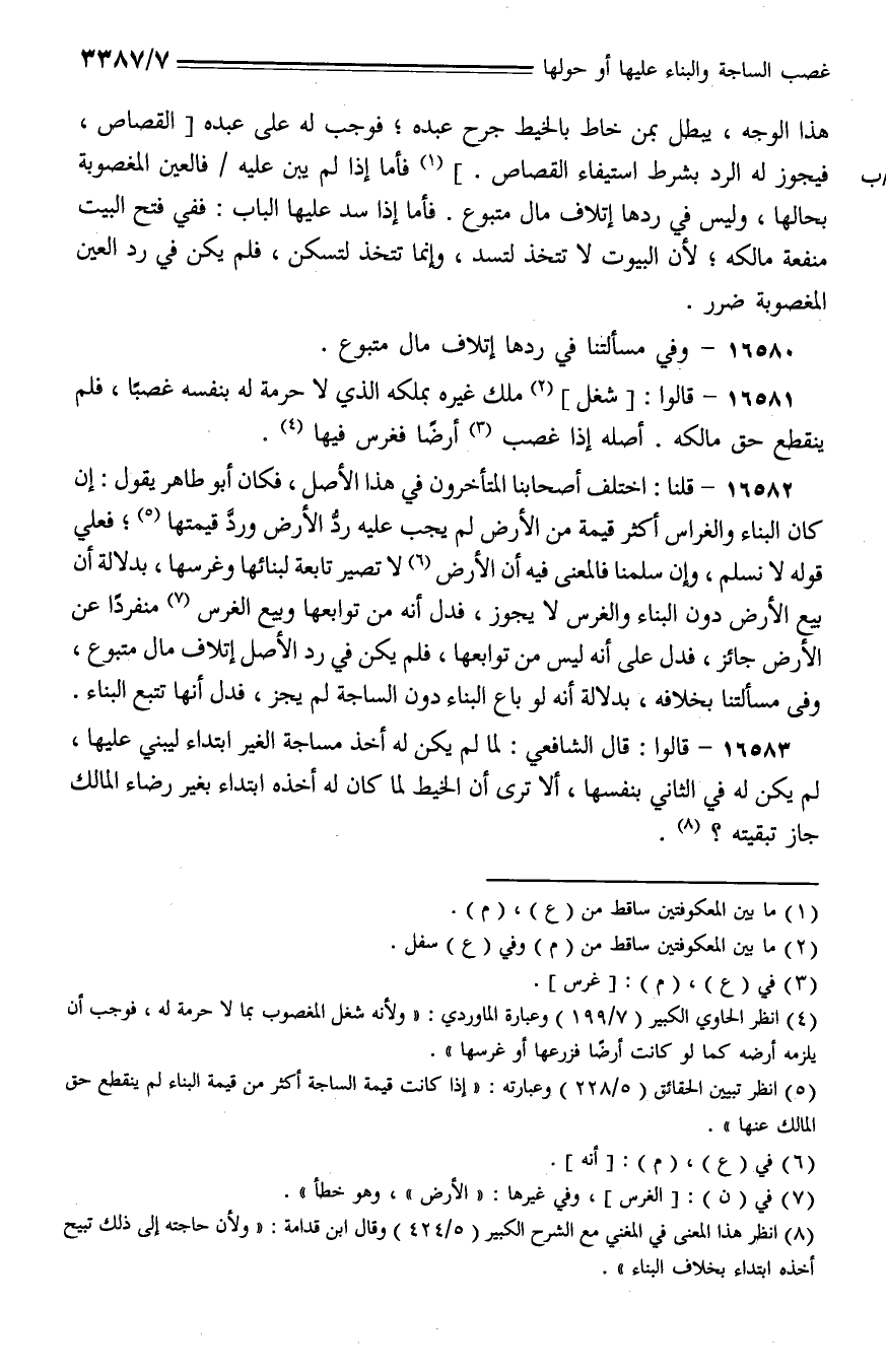 16582 - قلنا: اختلف أصحابنا المتأخرون في هذا الأصل، فكان أبو طاهر يقول: إن كان البناء والغراس أكثر قيمة من الأرض لم يجب عليه رد الأرض ورد قيمتها؛ فعلي قوله لا نسلم، وإن سلمنا فالمعني فيه أن الأرض لا تصير تابعة لبنائها وغرسها، بدلالة أن بيع الأرض دون البناء والغرس لا يجوز، فدل أنه من توابعها وبيع الغرس منفردًا عن الأرض جائز، فدل على أنه ليس من توابعها، فلم يكن في رد الأصل إتلاف مال متبوع، وفي مسألتنا بخلافه، بدلالة أنه لو باع البناء دون الساجة لم يجز، فدل أنها تتبع البناء.