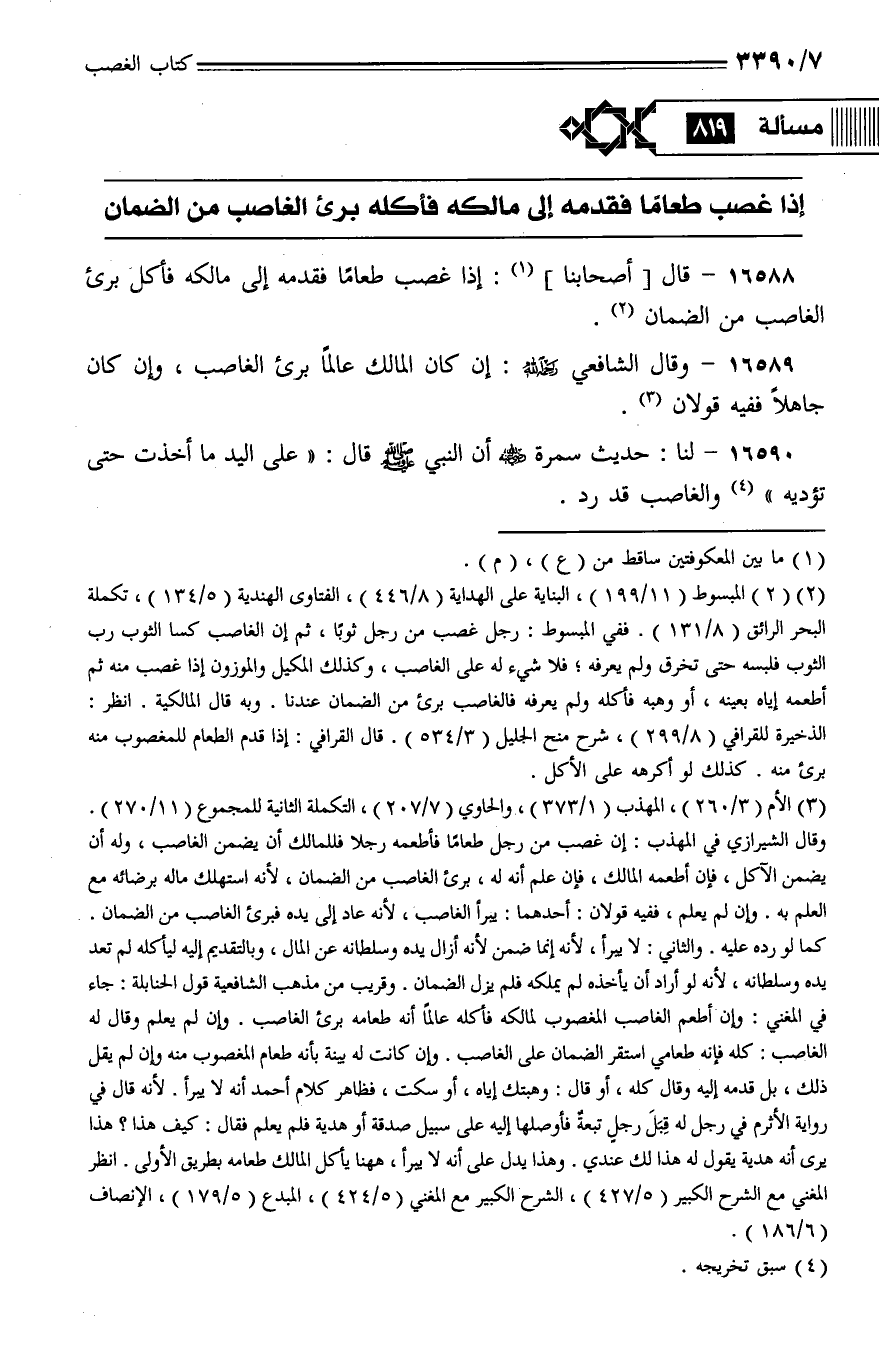 16588 - قال [أصحابنا]: إذا غصب طعامًا فقدمه إلى مالكه فأكل برئ الغاصب من الضمان.