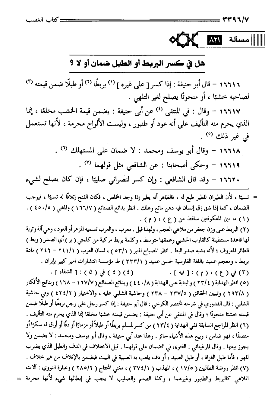 16616 - قال أبو حنيفة: إذا كسر [على غيره] بربطًا أو طبلًا ضمن قيمته لصاحبه خشبًا، أو منحوتًا يصلح لغير التلهي.