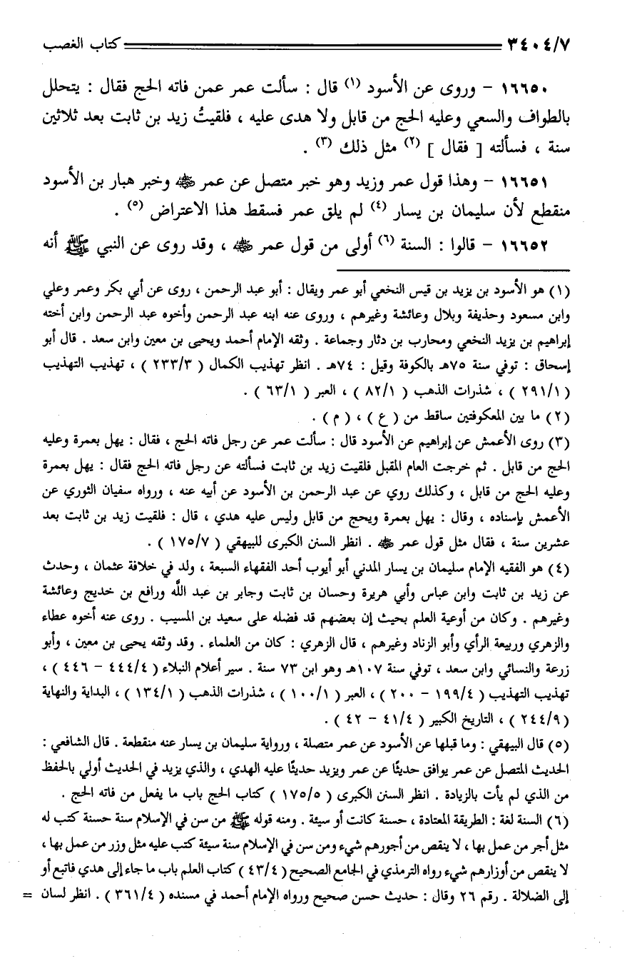 16650 - وروي عن الأسود قال: سألت عمر عمن فاته الحج فقال: يتحلل بالطواف والسعي وعليه الحج من قابل ولا هدي عليه، فلقيت زيد بن ثابت بعد ثلاثين سنة، فسألته [فقال] مثل ذلك.