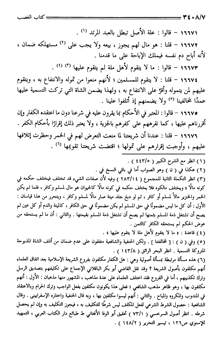 16674 - قلنا: لا يتقوم للمسلمين؛ لأنهم منعوا من تموله والانتفاع به، ويتقوم عليهم لمن يتموله وأقر على الانتفاع به، ولهذا يضمن الشاة التي تركت التسمية عليها عمدًا لمخالفينا ولا يضمنهم إذ أتلفوا علينا.