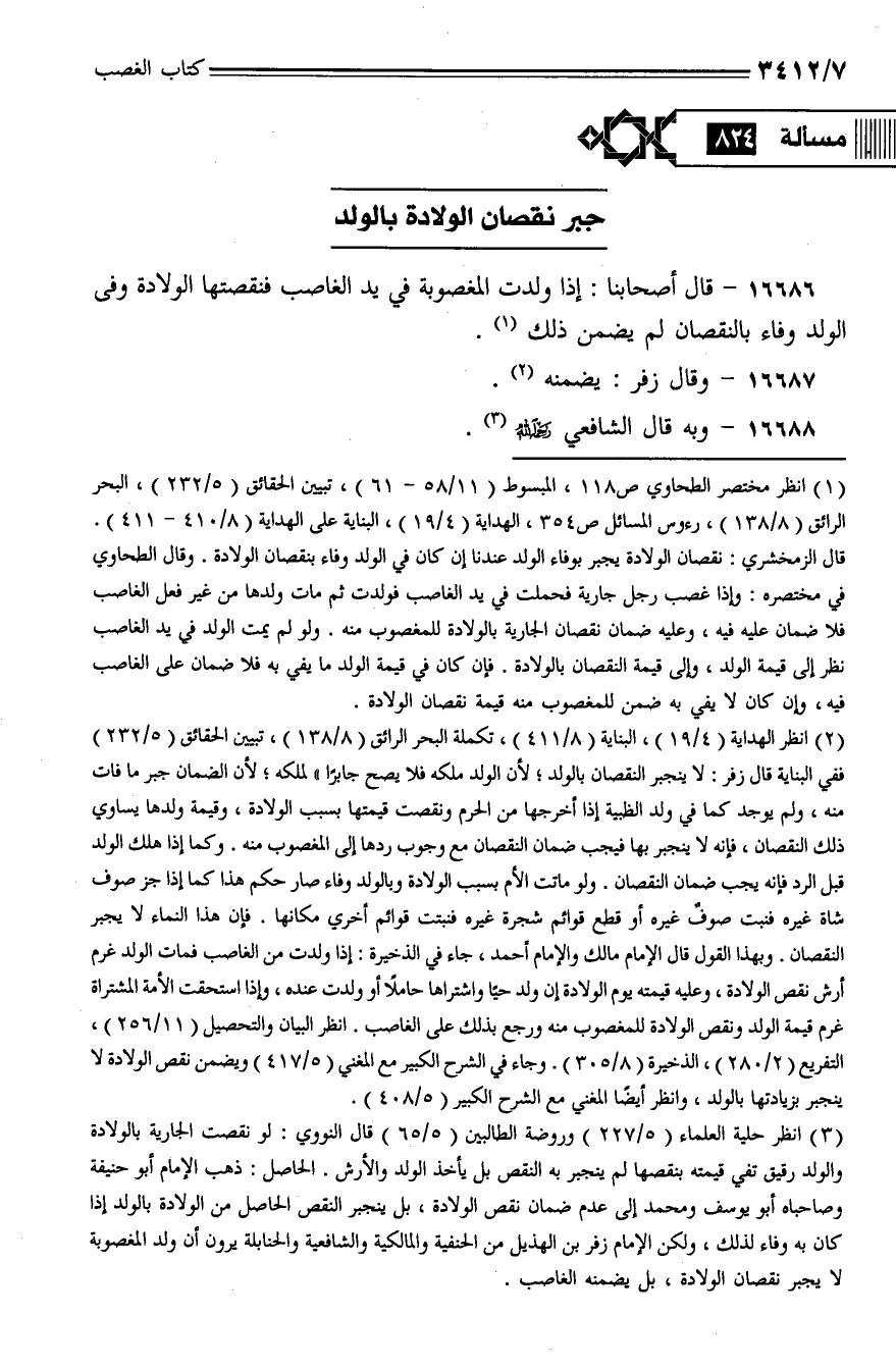 16686 - قال أصحابنا: إذا ولدت المغصوبة في يد الغاصب فنقصتها الولادة وفي الولد وفاء بالنقصان لم يضمن ذلك.
