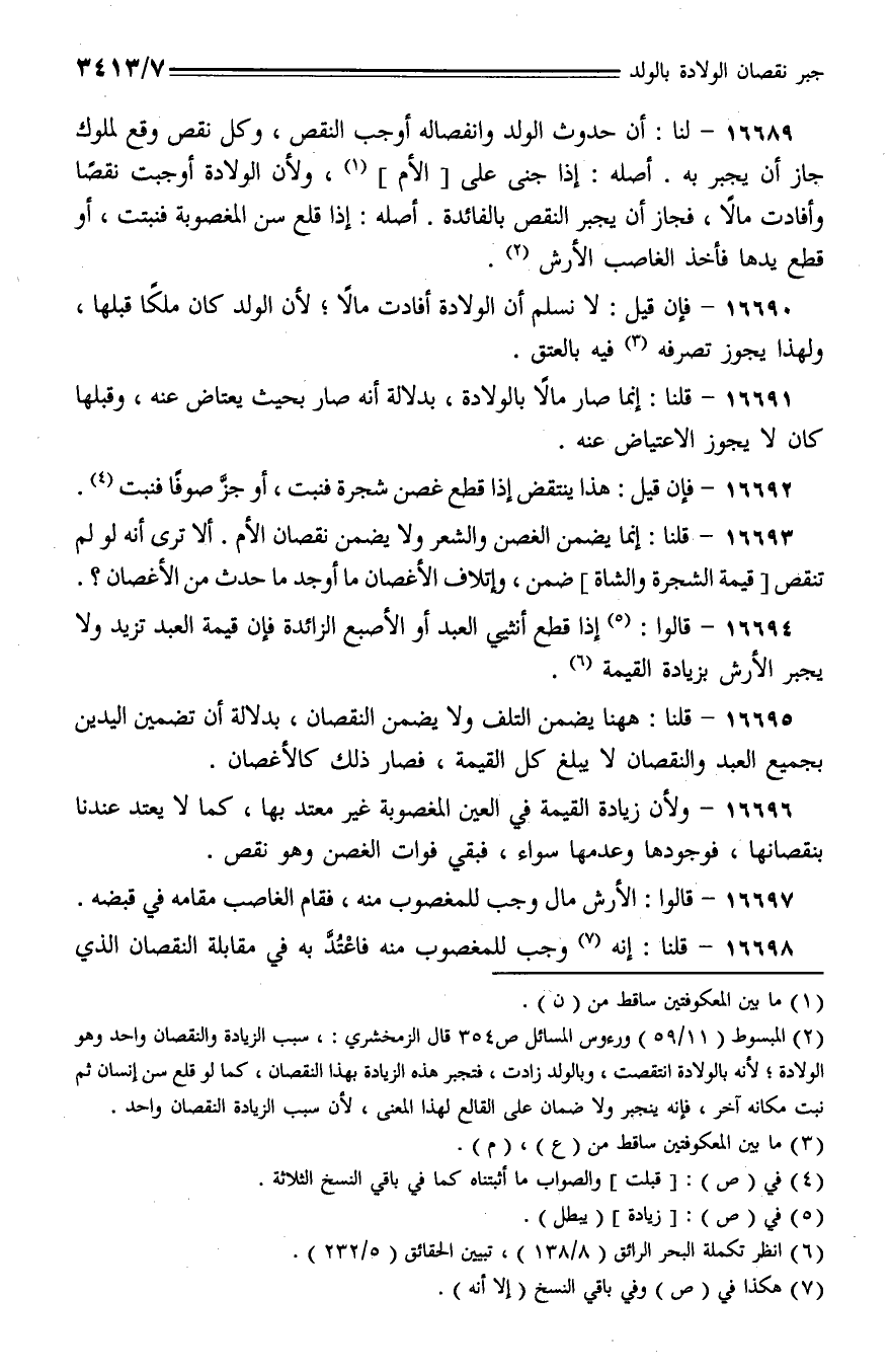 16696 - ولأن زيادة القيمة في العين المغصوبة غير معتد بها، كما لا يعتد عندنا بنقصانها، فوجودها وعدمها سواء، فبقي فوات الغصن وهو نقص.