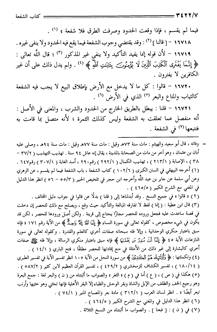 16718 - [قالنا]: وقد يقتضي وجوب الشفعة فيما يقع فيه الحدود ولا ينفي غيره.