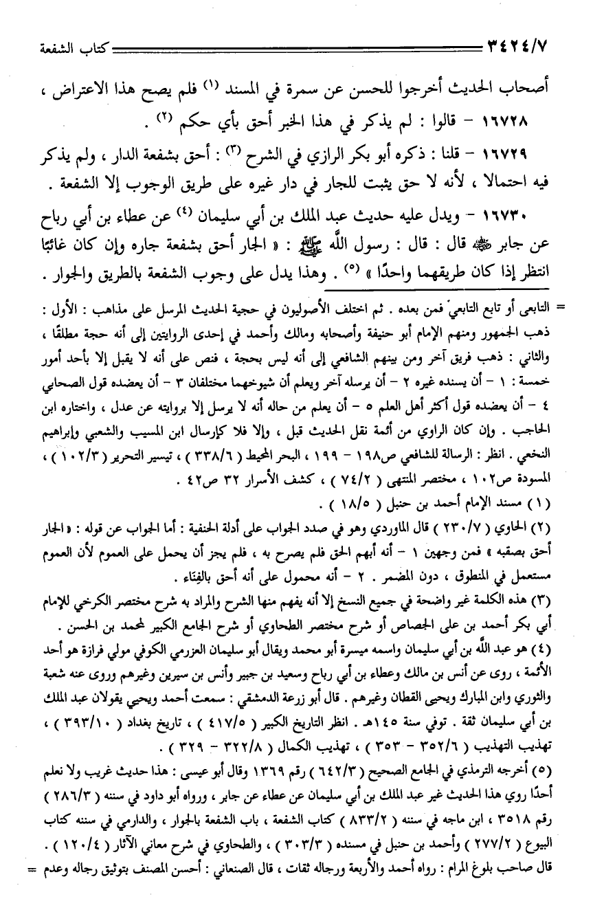 16729 - قلنا: ذكره أبو بكر الرازي في الشرح: أحق بشفعة الدار، ولم يذكر فيه احتمالا، لأنه لا حق يثبت للجار في دار غيره على طريق الوجوب إلا الشفعة.