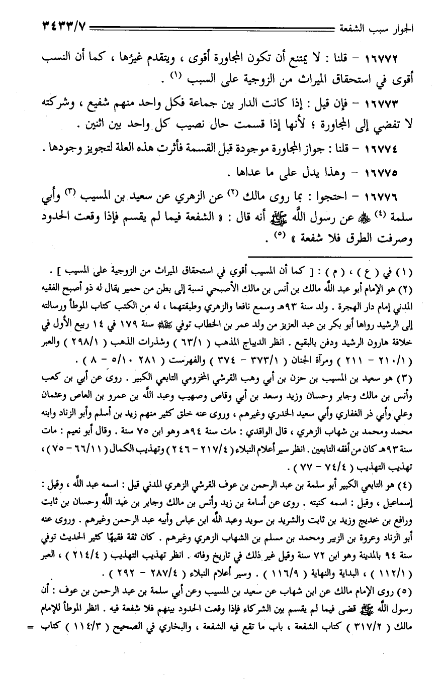 16776 - احتجوا: بما روي مالك عن الزهري عن سعيد بن المسيب وأبي سلمة - رضي الله عنه - عن رسول الله - صلى الله عليه وسلم - أنه قال: (الشفعة فيما لم يقسم فإذا وقعت الحدود وصرفت الطرق فلا شفعة).