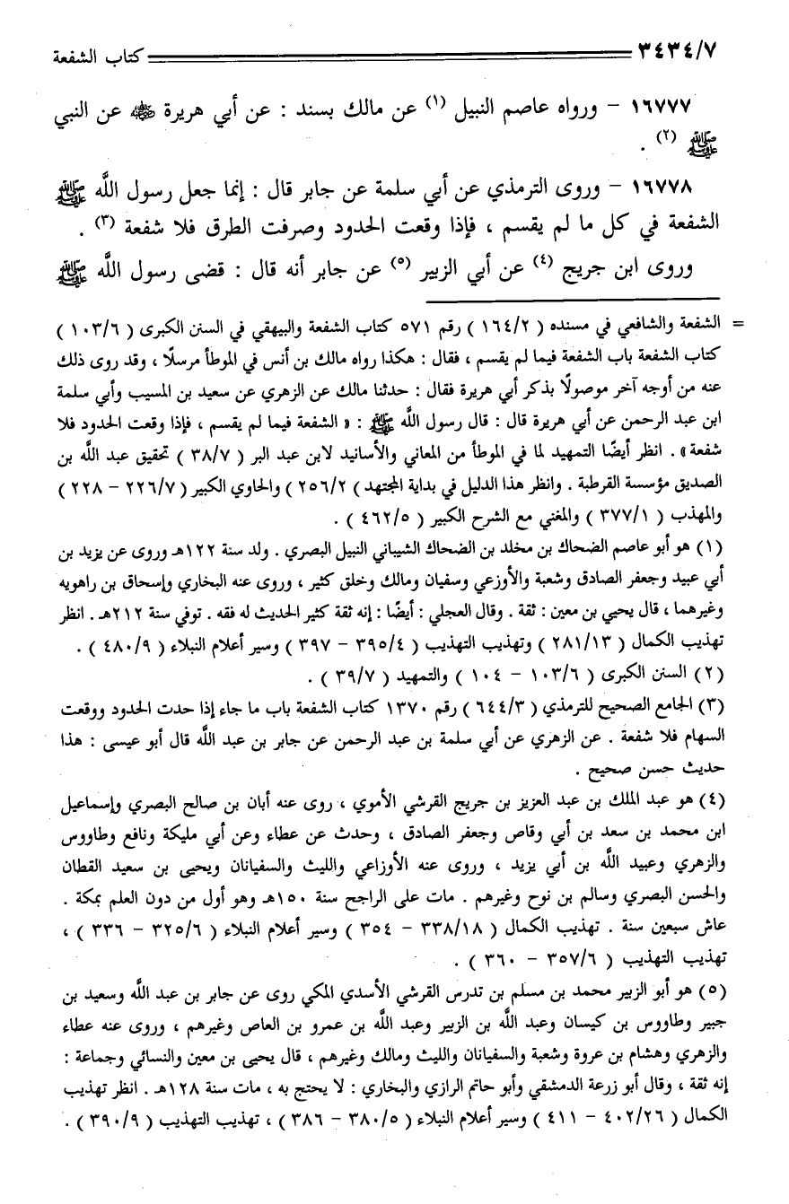16778 - وروي الترمذي عن أبي سلمة عن جابر قال: إنما جعل رسول الله - صلى الله عليه وسلم - الشفعة في كل ما لم يقسم، فإذا وقعت الحدود وصرفت الطرق فلا شفعة.