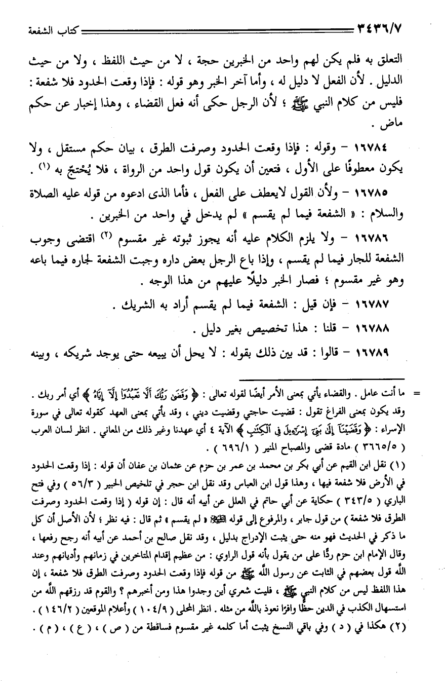 16784 - وقوله: فإذا وقعت الحدود وصرفت الطرق، بيان حكم مستقل، ولا يكون معطوفًا على الأول، فتعين أن يكون قول واحد من الرواة، فلا يحتج به.