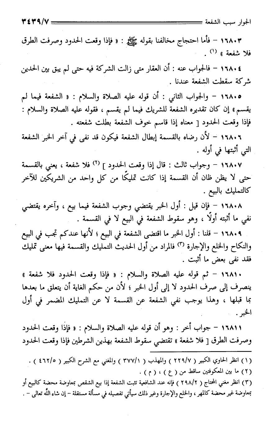 16811 - جواب أخر: وهو أن قوله عليه الصلاة والسلام: (فإذا وقعت الحدود وصرفت الطرق [فلا شفعة) تقتضي سقوط الشفعة بهذين الشرطين فإذا وقعت الحدود