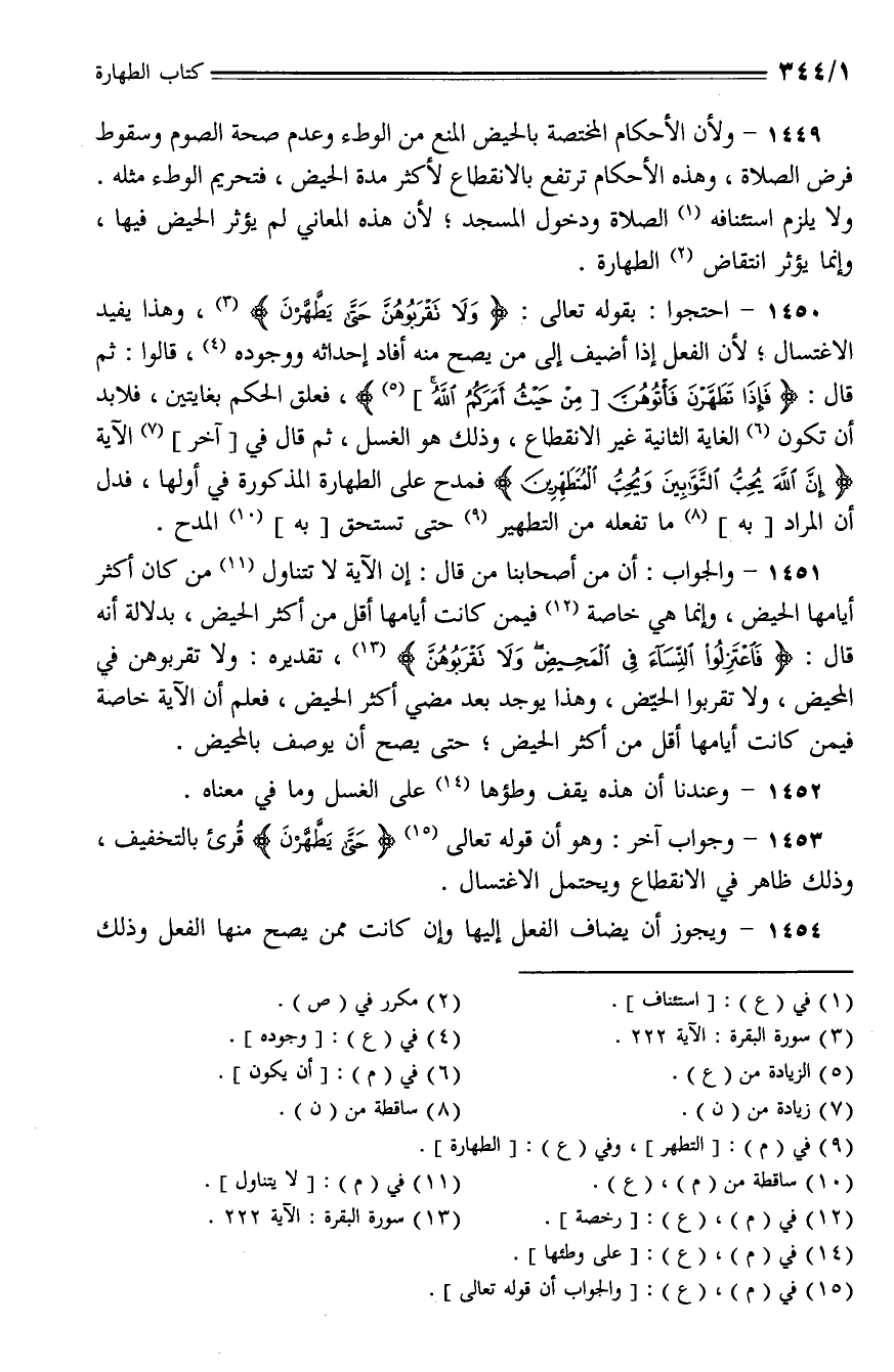 1450 - احتجوا: بقوله تعالى: {ولا تقربوهن حتى يطهرن}، وهذا يفيد الاغتسال؛ لأن الفعل إذا أضيف إلى من يصح منه أفاد إحداثه ووجوده، قالوا: ثم قال: {فإذا تطهرن فأتوهن من حيث أمركم الله}، فعلق الحكم بغايتين، فلا بد أن تكون الغاية الثانية غير الانقطاع، وذلك هو الغسل، ثم قال في آخر الآية {إن الله يحب التوابين ويحب المتطهرين} فمدح على الطهارة المذكورة في أولها، فدل أن المراد به ما تفعله من التطهير حتى تستحق به المدح.