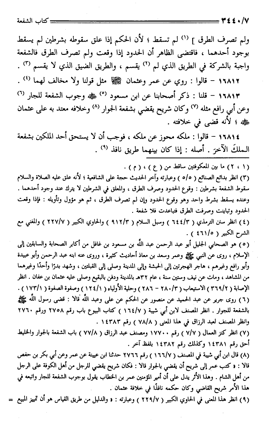 16813 - قلنا: ذكر أصحابنا عن ابن مسعود - رضي الله عنه - وجوب الشفعة للجار وعن أبي رافع مثله وكان شريح يقضي بشفعة الجوار وخلافه معتد به على عثمان - رضي الله عنه -؛ لأنه قضى في خلافته.