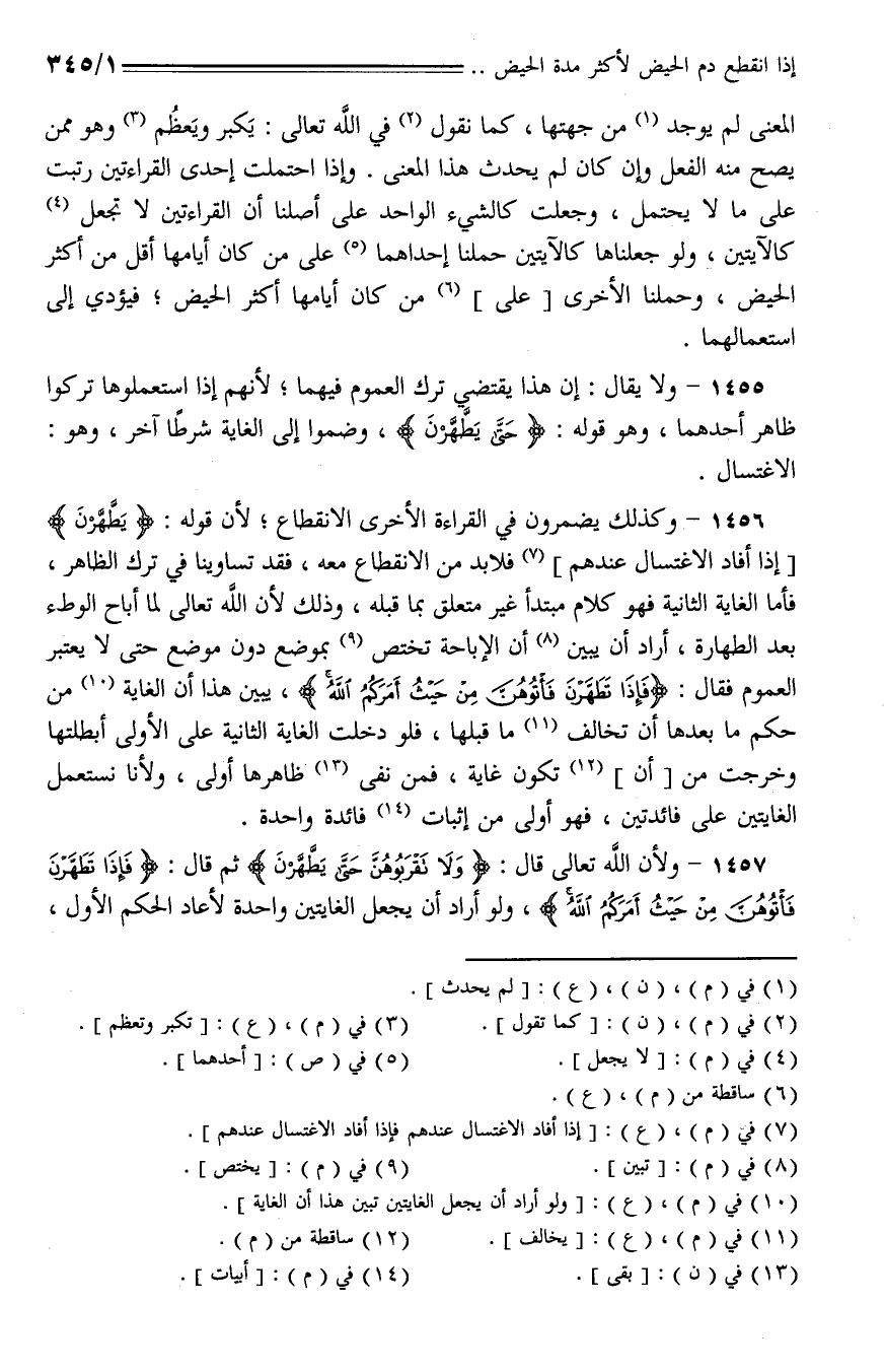 1457 - ولأن الله تعالى قال: {ولا تقربوهن حتى يطهرن} ثم قال: {فإذا تطهرن فأتوهن من حيث أمركم الله}، ولو أراد أن يجعل الغايتين واحدة لأعاد الحكم الأول،