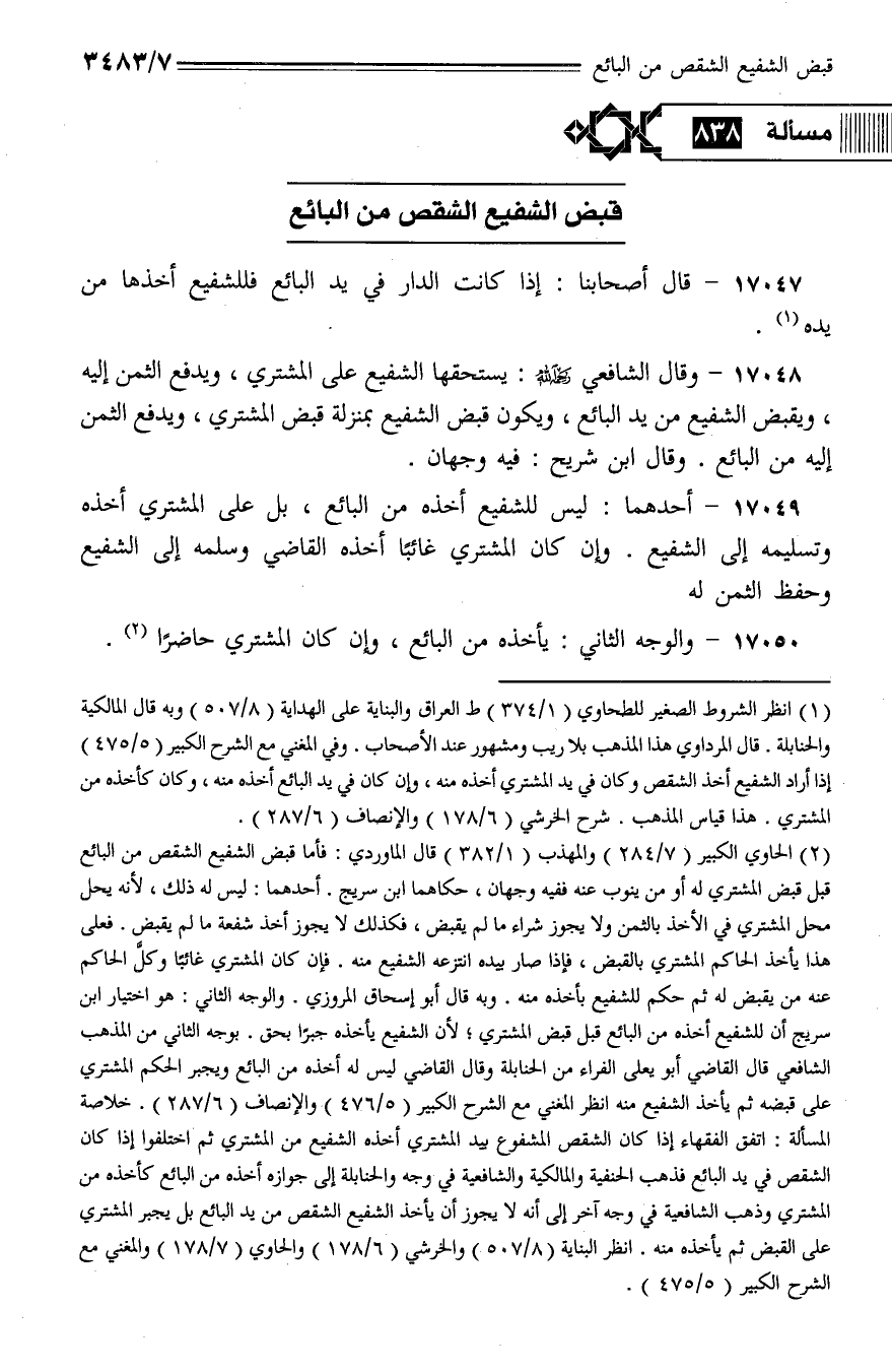 17049 - أحدهما: ليس للشفيع أخذه من البائع، بل على المشتري أخذه وتسليمه إلى الشفيع. وإن كان المشتري غائبًا أخذه القاضي وسلمه إلى الشفيع وحفظ الثمن له