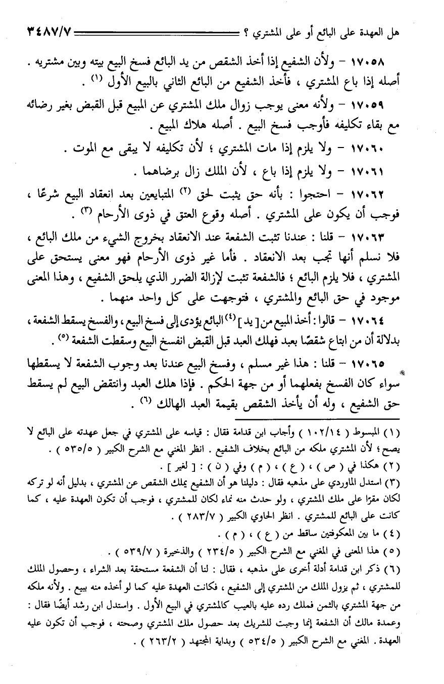 17063 - قلنا: عندنا تثبت الشفعة عند الانعقاد بخروج الشيء من ملك البائع، فلا نسلم أنها تجب بعد الانعقاد. فأما غير ذوى الأرحام فهو معنى يستحق على المشتري، فلا يلزم البائع؛ فالشفعة تثبت لإزالة الضرر الذي يلحق الشفيع، وهذا المعنى موجود في حق البائع والمشتري، فتوجهت على كل واحد منهما.
