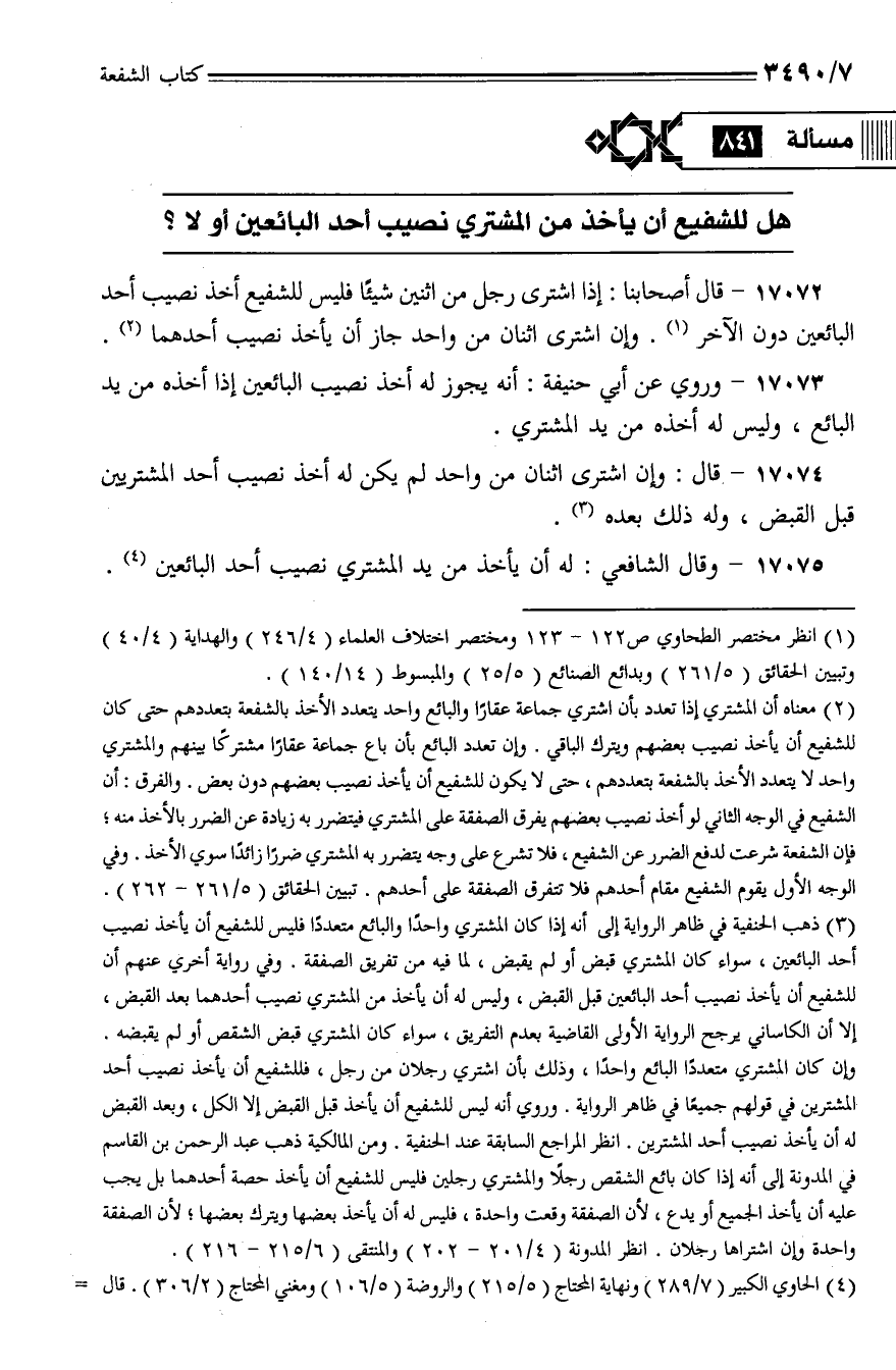 17072 - قال أصحابنا: إذا اشترى رجل من اثنين شيئًا فليس للشفيع أخذ نصيب أحد البائعين دون الآخر. وإن اشترى اثنان من واحد جاز أن يأخذ نصيب أحدهما.