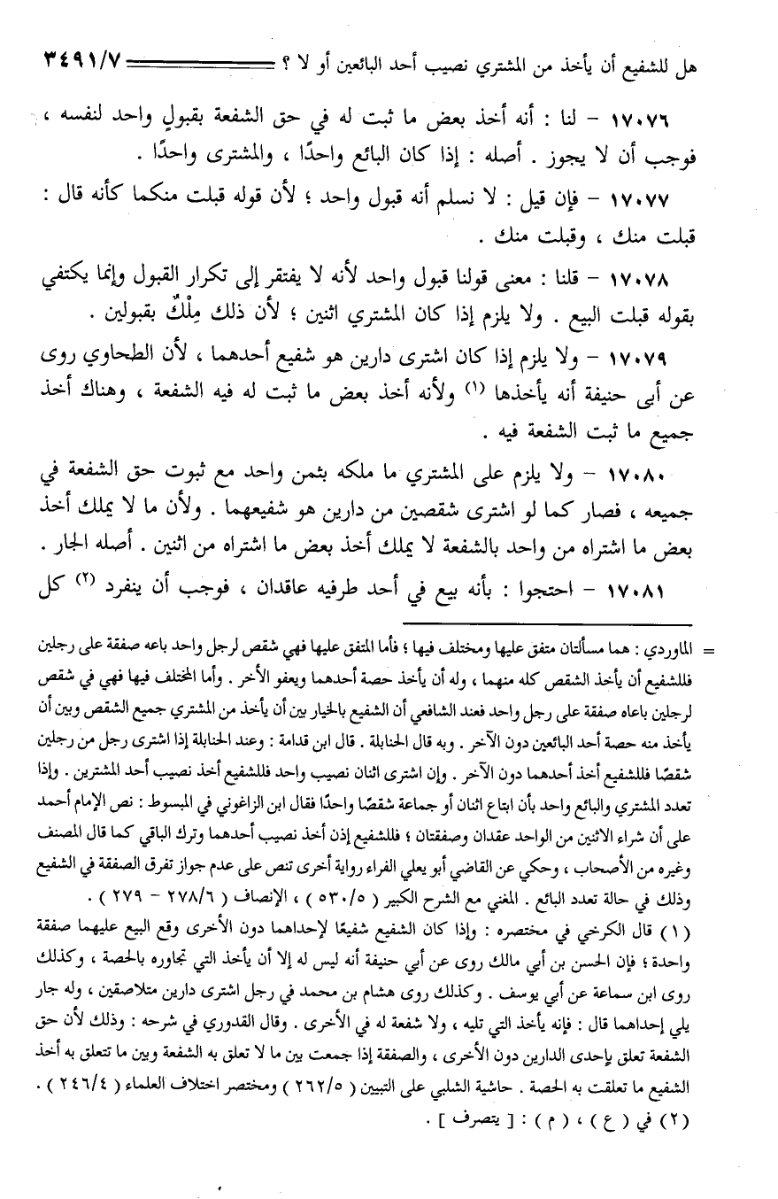 17079 - ولا يلزم إذا كان اشترى دارين هو شفيع أحدهما، لأن الطحاوي روى عن أبي حنيفة أنه يأخذها ولأنه أخذ بعض ما ثبت له فيه الشفعة، وهناك أخذ جميع ما ثبت الشفعة فيه.