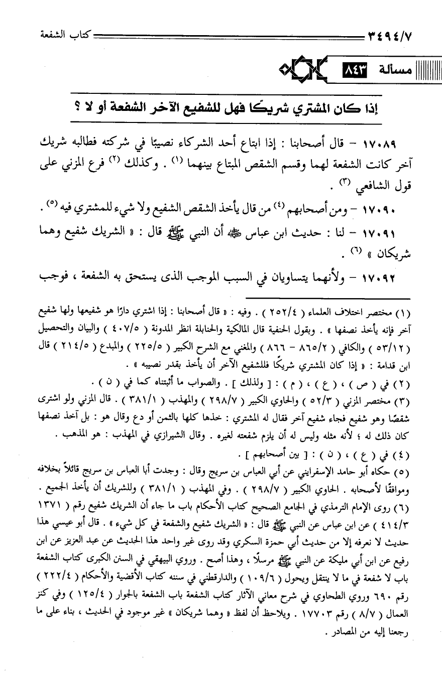 17089 - قال أصحابنا: إذا ابتاع أحد الشركاء نصيبًا في شركته فطالبه شريكه آخر كانت الشفعة لهما وقسم الشقص المبتاع بينهما. وكذلك فرع المزني على قول الشافعي.