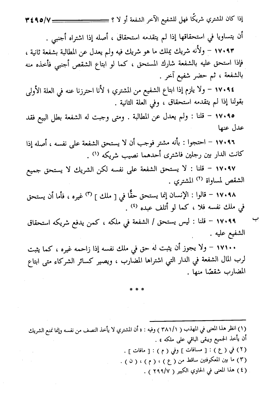 17096 - احتجوا: بأنه مشتر فوجب أن لا يستحق الشفعة على نفسه، أصله إذا كانت الدار بين رجلين فاشترى أحدهما نصيب شريكه.