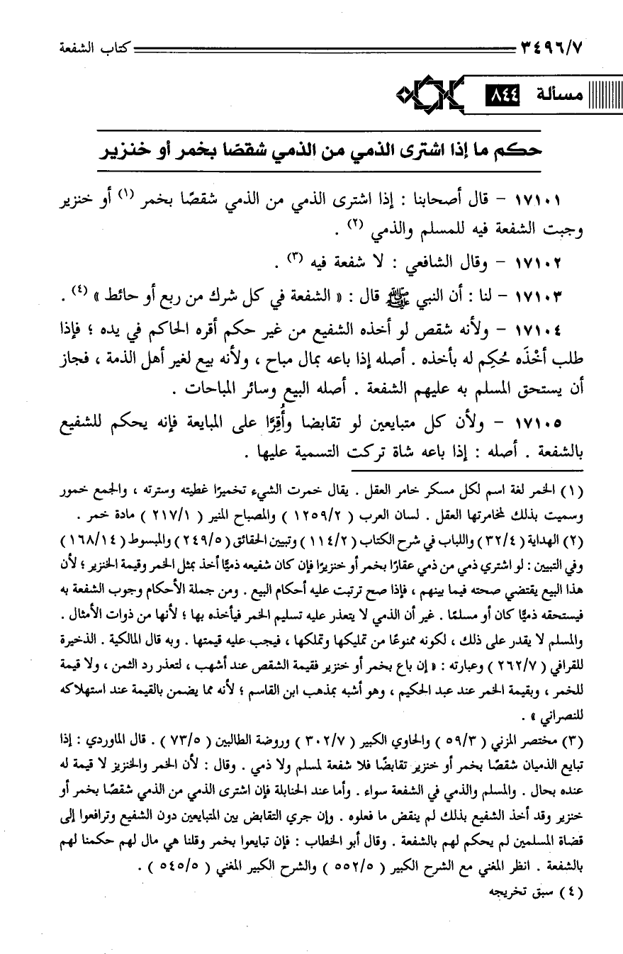 17101 - قال أصحابنا: إذا اشترى الذمي من الذمي شقصًا بخمر أو خنزير وجبت الشفعة فيه للمسلم والذمي.