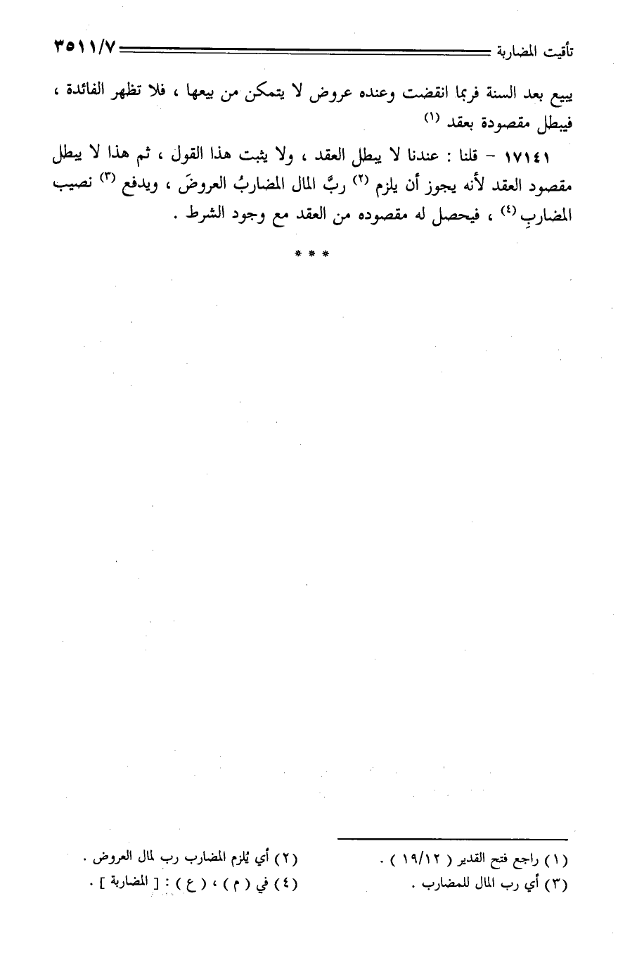17141 - قلنا: عندنا لا يبطل العقد، ولا يثبت هذا القول، ثم هذا لا يبطل مقصود العقد لأنه يجوز أن يلزم رب المال المضارب العروض، ويدفع نصيب المضارب، فيحصل له مقصوده من العقد مع وجود الشرط.