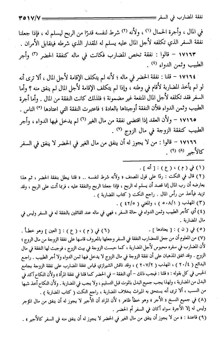17163 - قالوا: نفقة تخص المضارب فكانت في ماله كنفقة الحضر وأجر الطبيب وثمن الدواء.