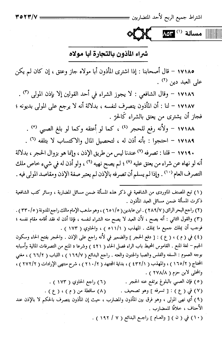 17190 - قلنا: تصرفه عندنا ليس من طريق الإذن، وإنما هو بزوال الحجر، بدلالة أنه لو نهاه عن شراء من يعتق عليه؛ لم يصح نهيه، ولو أذن له في شيء خاص ملك التصرف العام. وإذا لم يسلم أن تصرفه بالإذن لم يعتبر صفة الإذن ومقاصد المولى فيه.