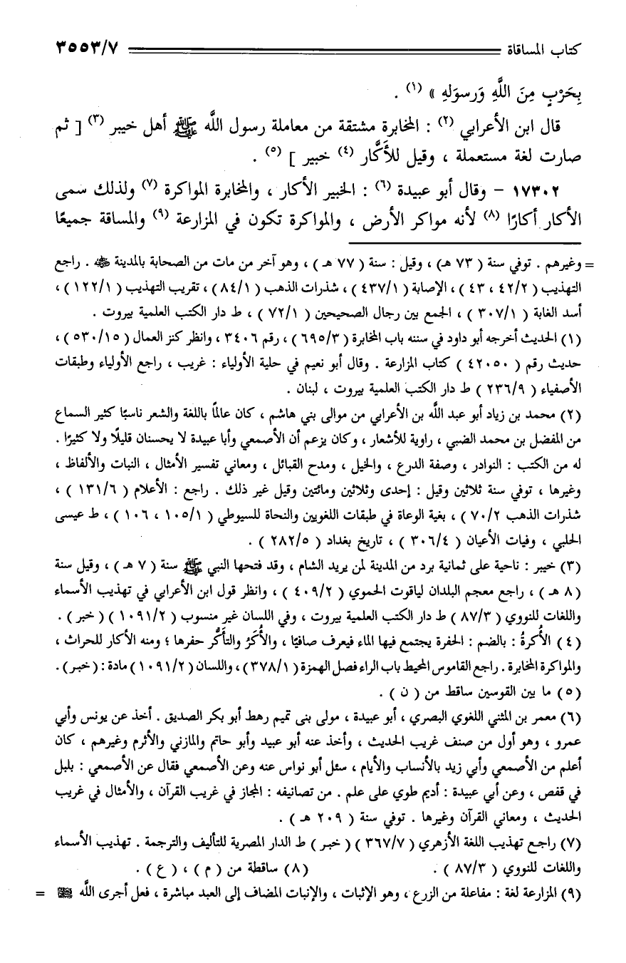 17302 - وقال أبو عبيدة: الخبير الأكار، والمخابرة المواكرة ولذلك سمى الأكار أكارًا لأنه مواكر الأرض، والمواكرة تكون في المزارعة والمسافة جميعًا