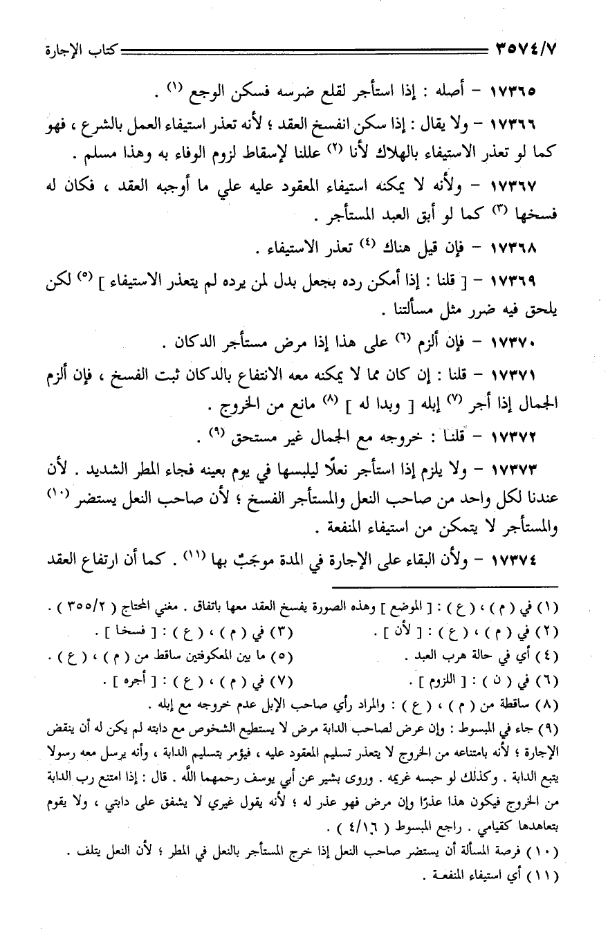 17373 - ولا يلزم إذا استأجر نعلًا ليلبسها في يوم بعينه فجاء المطر الشديد. لأن عندنا لكل واحد من صاحب النعل والمستأجر الفسخ؛ لأن صاحب النعل يستضر والمستأجر لا يتمكن من استيفاء المنفعة.