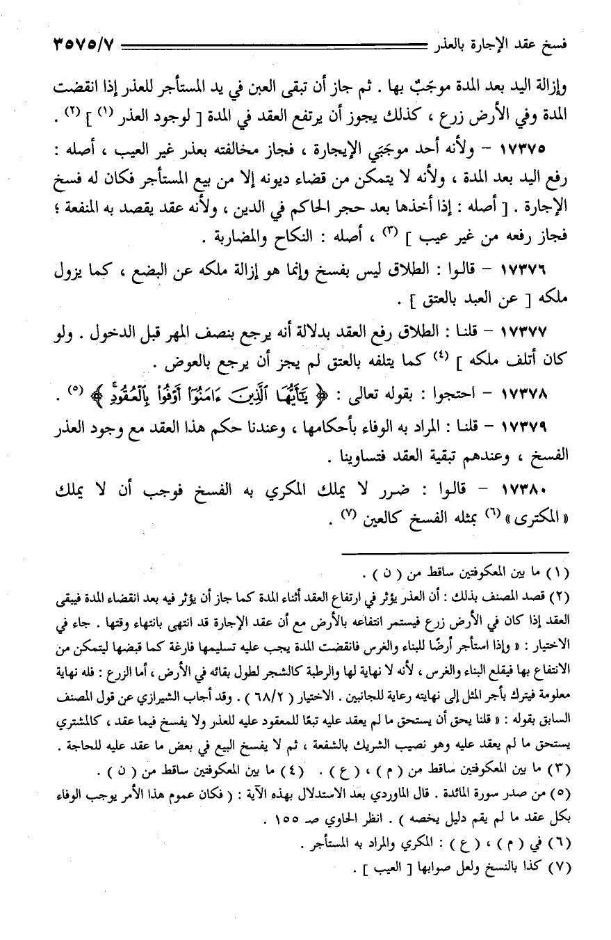 17379 - قلنا: المراد به الوفاء بأحكامها، وعندنا حكم هذا العقد مع وجود العذر الفسخ، وعندهم تبقية العقد فتساوينا.