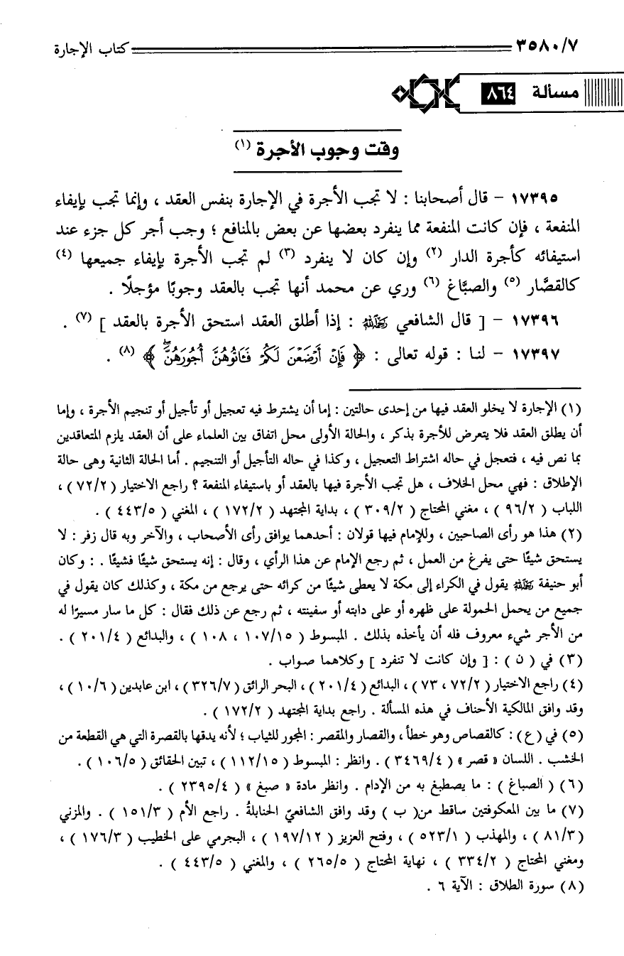17395 - قال أصحابنا: لا تجب الأجرة في الإجارة بنفس العقد، وإنما تجب بإيفاء المنفعة، فإن كانت المنفعة مما ينفرد بعضها عن بعض بالمنافع؛ وجب أجر كل جزء عند استيفائه كأجرة الدار وإن كان لا ينفرد لم تجب الأجرة بإيفاء جميعها كالقصار والصباغ وري عن محمد أنها تجب بالعقد وجوبًا مؤجلًا.
