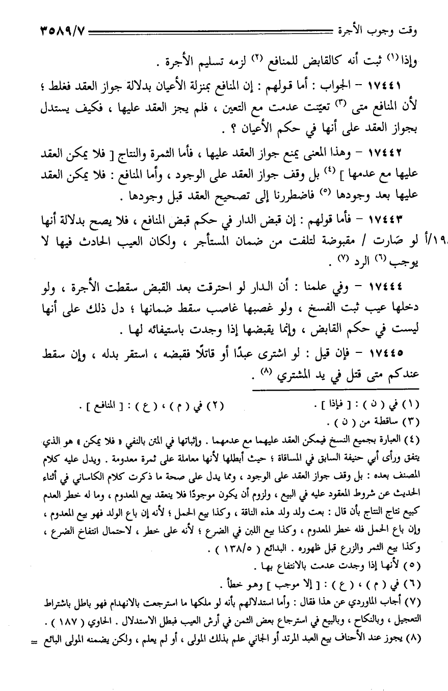 17443 - فأما قولهم: إن قبض الدار في حكم قبض المنافع، فلا يصح بدلالة أنها لو صارت/ مقبوضة لتلفت من ضمان المستأجر، ولكان العيب الحادث فيها لا يوجب الرد.