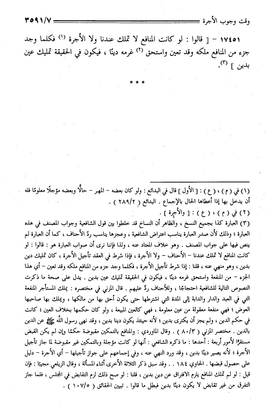 17451 - [قالوا: لو كانت المنافع لا تملك عندنا ولا الأجرة فكلما وجد جزء من المنافع ملكه وقد تعين واستحق غرمه دينًا، فيكون في الحقيقة تمليك عين بدين].