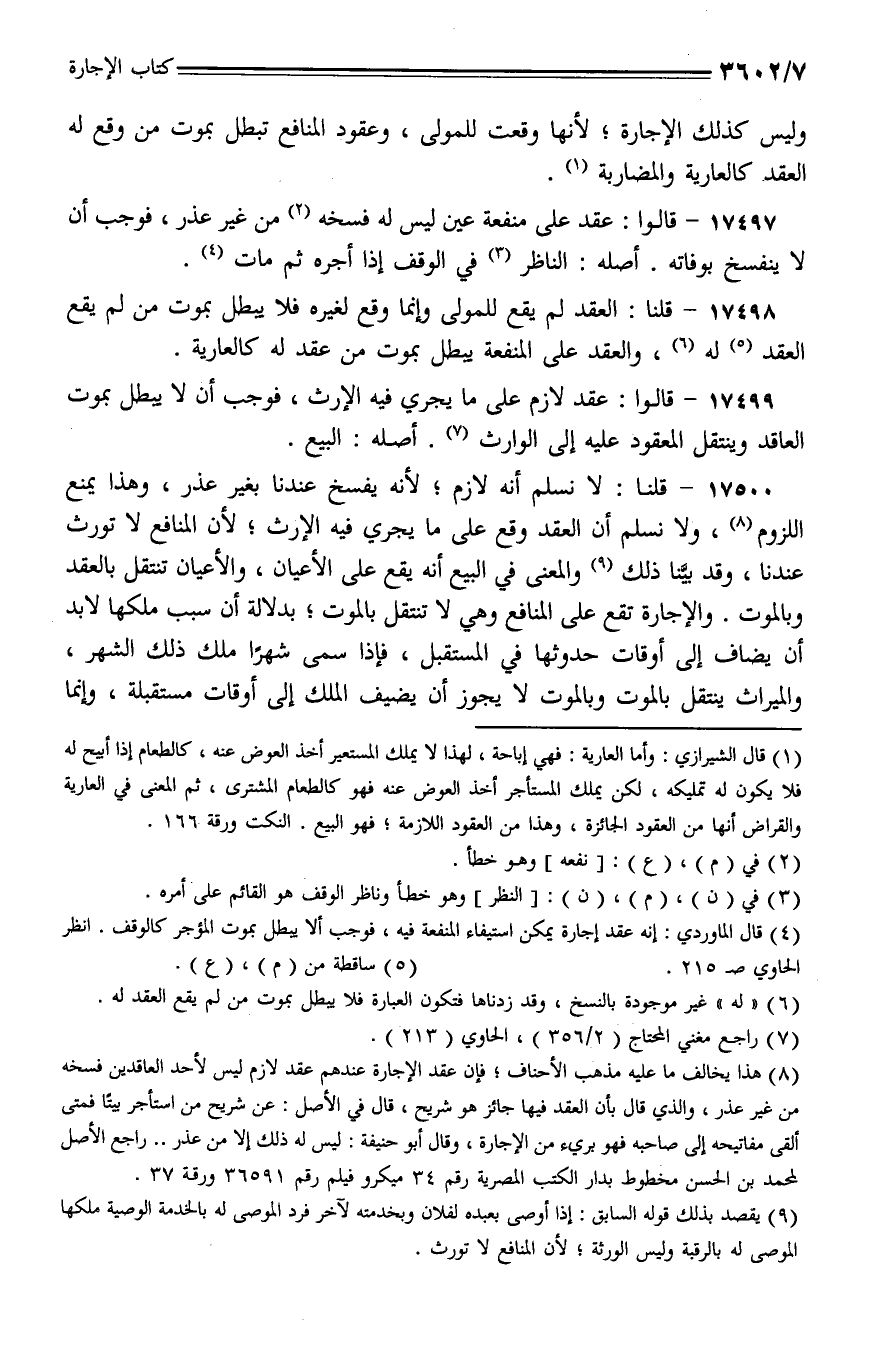 17499 - قالوا: عقد لازم على ما يجري فيه الإرث، فوجب أن لا يبطل بموت العاقد وينتقل المعقود عليه إلى الوارث. أصله: البيع.