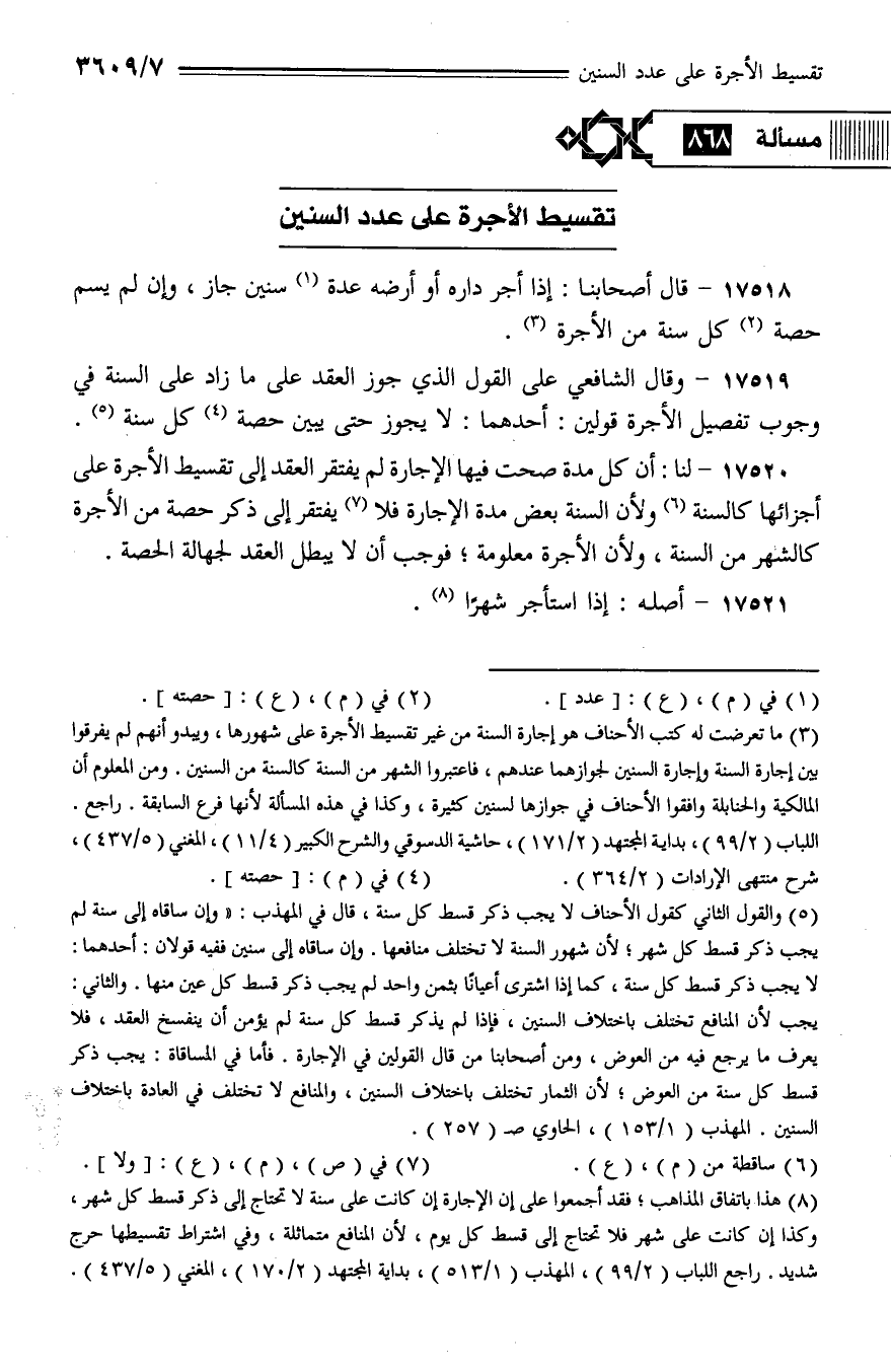 17520 - لنا: أن كل مدة صحت فيها الإجارة لم يفتقر العقد إلى تقسيط الأجرة على أجزائها كالسنة ولأن السنة بعض مدة الإجارة فلا يفتقر إلى ذكر حصة من الأجرة كالشهر من السنة، ولأن الأجرة معلومة؛ فوجب أن لا يبطل العقد لجهالة الحصة.