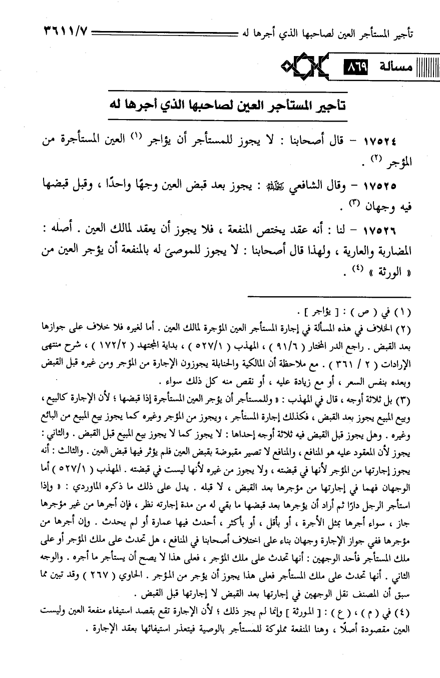 17524 - قال أصحابنا: لا يجوز للمستأجر أن يؤاجر العين المستأجرة من المؤجر.