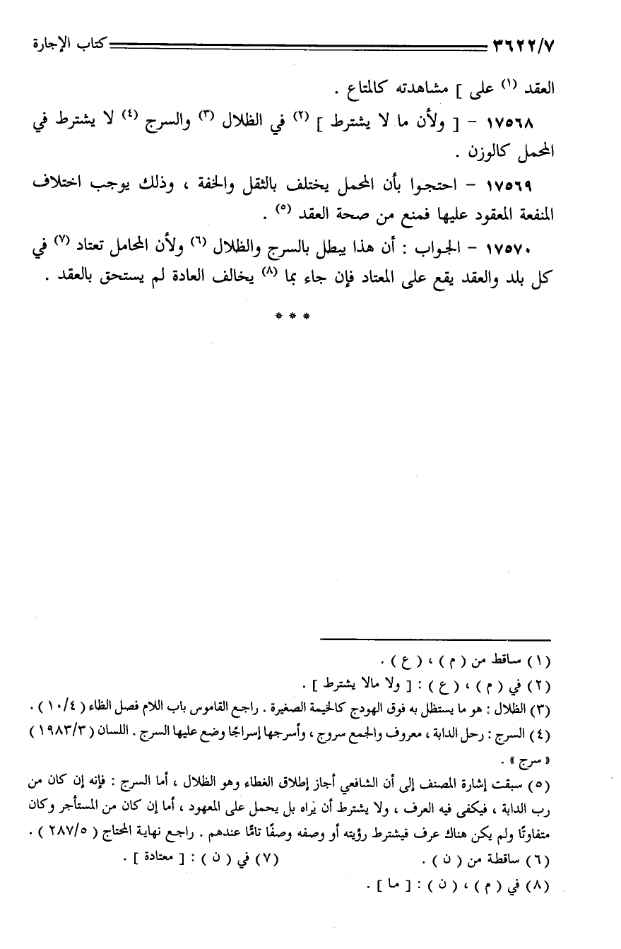 17568 - [ولأن ما لا يشترط] في الظلال والسرج لا يشترط في المحمل كالوزن.